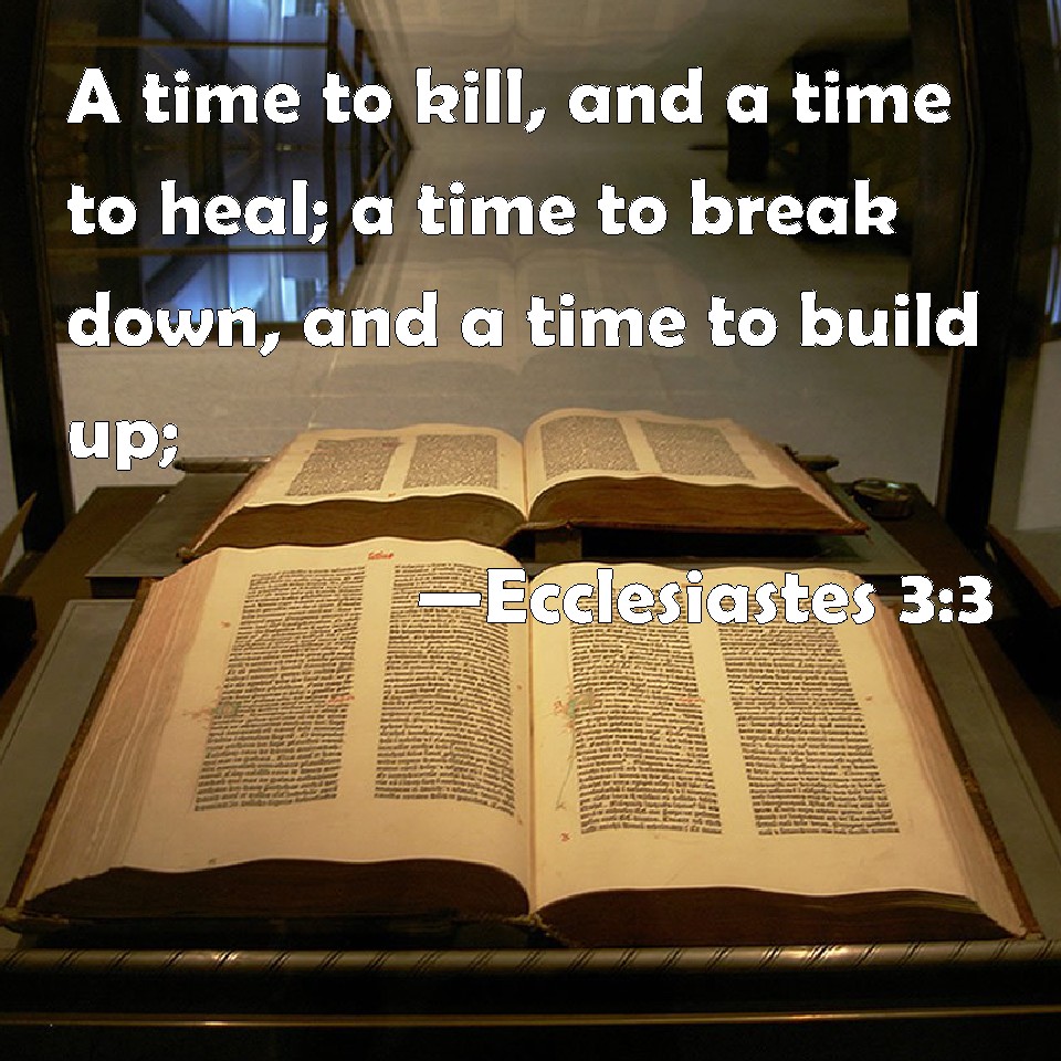 Choose a Background Ecclesiastes 3:3 A time to kill, and a time to heal; a time to break down, and a time to build up; KJV: A time to kill, and a time to heal; a time to break down, and a time to build up; DRB: A time to kill, and a time to heal. A time to destroy, and a time to build. DBT: A time to kill, and a time to heal; A time to break down, and a time to build up; ERV: a time to kill, and a time to heal; a time to break down, and a time to build up; WBT: A time to kill, and a time to heal; a time to break down, and a time to build up; WEB: a time to kill, and a time to heal; a time to break down, and a time to build up; YLT: A time to slay, And a time to heal, A time to break down, And a time to build up.Links Ecclesiastes 3:3 NIV • Ecclesiastes 3:3 NLT • Ecclesiastes 3:3 ESV • Ecclesiastes 3:3 NASB • Ecclesiastes 3:3 KJV • Ecclesiastes 3:3 Interlinear • Ecclesiastes 3:3 Commentaries • Ecclesiastes 3:3 Parallel Texts • Ecclesiastes 3:3 Bible Apps • Ecclesiastes 3:3 Parallel • Bible Hub |