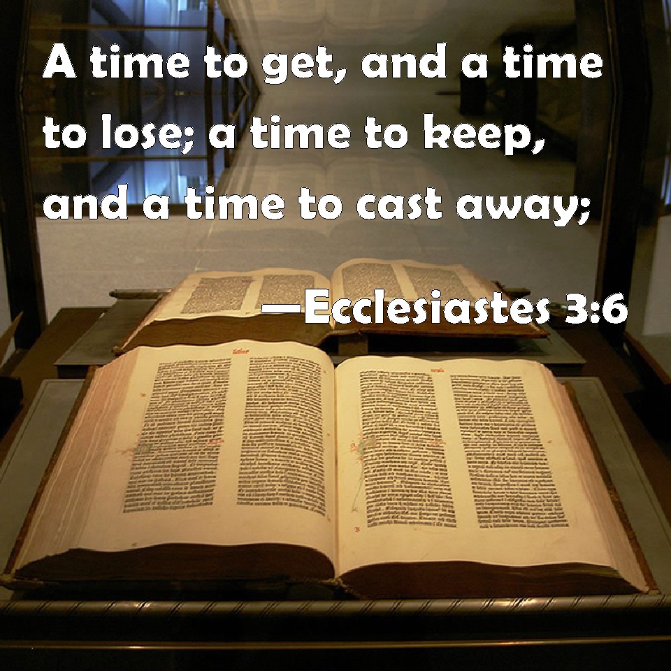 Choose a Background Ecclesiastes 3:6 A time to get, and a time to lose; a time to keep, and a time to cast away; KJV: A time to get, and a time to lose; a time to keep, and a time to cast away; DRB: A time to get, and a time to lose. A time to keep, and a time to cast away. DBT: A time to seek, and a time to lose; A time to keep, and a time to cast away; ERV: a time to seek, and a time to lose; a time to keep, and a time to cast away; WBT: A time to get, and a time to lose; a time to keep, and a time to cast away; WEB: a time to seek, and a time to lose; a time to keep, and a time to cast away; YLT: A time to seek, And a time to destroy. A time to keep, And a time to cast away.Links Ecclesiastes 3:6 NIV • Ecclesiastes 3:6 NLT • Ecclesiastes 3:6 ESV • Ecclesiastes 3:6 NASB • Ecclesiastes 3:6 KJV • Ecclesiastes 3:6 Interlinear • Ecclesiastes 3:6 Commentaries • Ecclesiastes 3:6 Parallel Texts • Ecclesiastes 3:6 Bible Apps • Ecclesiastes 3:6 Parallel • Bible Hub |