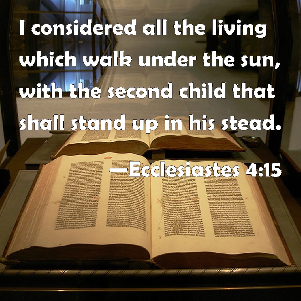 Choose a Background Ecclesiastes 4:15 I considered all the living which walk under the sun, with the second child that shall stand up in his stead. KJV: I considered all the living which walk under the sun, with the second child that shall stand up in his stead. DRB: I saw all men living, that walk under the sun with the second young man, who shall rise up in his place. DBT: I saw all the living that walk under the sun, with the child, the second, that should stand up in his stead. ERV: I saw all the living which walk under the sun, that they were with the youth, the second, that stood up in his stead. WBT: I considered all the living who walk under the sun, with the second child that shall stand up in his stead. WEB: I saw all the living who walk under the sun, that they were with the youth, the other, who succeeded him. YLT: I have seen all the living, who are walking under the sun, with the second youth who doth stand in his place;Links Ecclesiastes 4:15 NIV • Ecclesiastes 4:15 NLT • Ecclesiastes 4:15 ESV • Ecclesiastes 4:15 NASB • Ecclesiastes 4:15 KJV • Ecclesiastes 4:15 Interlinear • Ecclesiastes 4:15 Commentaries • Ecclesiastes 4:15 Parallel Texts • Ecclesiastes 4:15 Bible Apps • Ecclesiastes 4:15 Parallel • Bible Hub |
