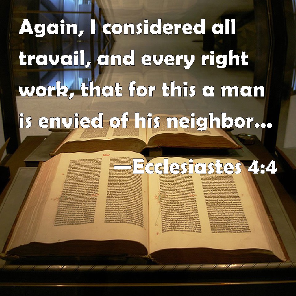 Choose a Background Ecclesiastes 4:4 Again, I considered all travail, and every right work, that for this a man is envied of his neighbor. This is also vanity and vexation of spirit. KJV: Again, I considered all travail, and every right work, that for this a man is envied of his neighbour. This is also vanity and vexation of spirit. DRB: Again I considered all the labours of men, and I remarked that their industries are exposed to the envy of their neighhour: so in this also there is vanity, and fruitless care. DBT: And I saw all labour, and all success of work, that it is man's jealousy of his neighbour. This also is vanity and pursuit of the wind. ERV: Then I saw all labour and every skilful work, that for this a man is envied of his neighbour. This also is vanity and a striving after wind. WBT: Again, I considered all labor, and every right work, that for this a man is envied by his neighbor. This is also vanity and vexation of spirit. WEB: Then I saw all the labor and achievement that is the envy of a man's neighbor. This also is vanity and a striving after wind. YLT: And I have seen all the labour, and all the benefit of the work, because for it a man is the envy of his neighbour. Even this is vanity and vexation of spirit.Links Ecclesiastes 4:4 NIV • Ecclesiastes 4:4 NLT • Ecclesiastes 4:4 ESV • Ecclesiastes 4:4 NASB • Ecclesiastes 4:4 KJV • Ecclesiastes 4:4 Interlinear • Ecclesiastes 4:4 Commentaries • Ecclesiastes 4:4 Parallel Texts • Ecclesiastes 4:4 Bible Apps • Ecclesiastes 4:4 Parallel • Bible Hub |