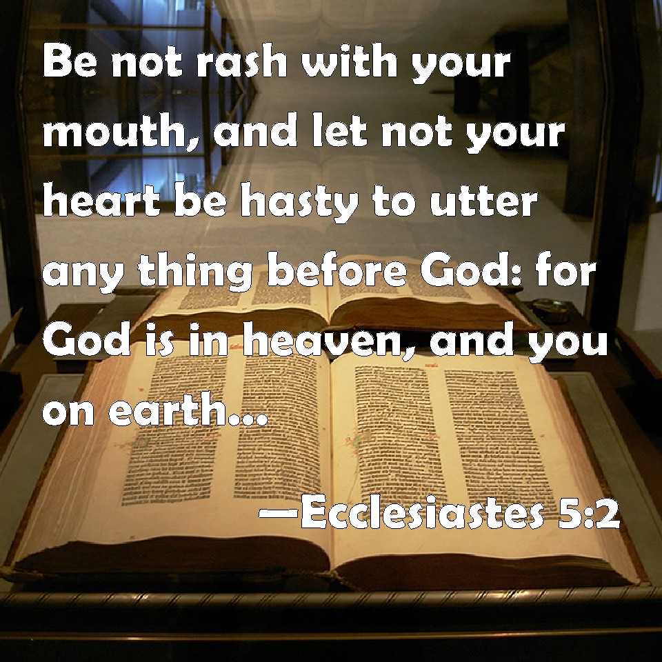 Choose a Background Ecclesiastes 5:2 Be not rash with your mouth, and let not your heart be hasty to utter any thing before God: for God is in heaven, and you on earth: therefore let your words be few. KJV: Be not rash with thy mouth, and let not thine heart be hasty to utter any thing before God: for God is in heaven, and thou upon earth: therefore let thy words be few. DRB: Speak not any thing rashly, and let not thy heart be hasty to utter a word before God. For God is in heaven, and thou upon earth: therefore let thy words be few. DBT: Be not rash with thy mouth, and let not thy heart be hasty to utter anything before God: for God is in the heavens, and thou upon earth; therefore let thy words be few. ERV: Be not rash with thy mouth, and let not thine heart be hasty to utter any thing before God; for God is in heaven, and thou upon earth: therefore let thy words be few. WBT: Be not rash with thy mouth, and let not thy heart be hasty to utter any thing before God: for God is in heaven, and thou upon earth: therefore let thy words be few. WEB: Don't be rash with your mouth, and don't let your heart be hasty to utter anything before God; for God is in heaven, and you on earth. Therefore let your words be few. YLT: Cause not thy mouth to hasten, and let not thy heart hasten to bring out a word before God, for God is in the heavens, and thou on the earth, therefore let thy words be few.Links Ecclesiastes 5:2 NIV • Ecclesiastes 5:2 NLT • Ecclesiastes 5:2 ESV • Ecclesiastes 5:2 NASB • Ecclesiastes 5:2 KJV • Ecclesiastes 5:2 Interlinear • Ecclesiastes 5:2 Commentaries • Ecclesiastes 5:2 Parallel Texts • Ecclesiastes 5:2 Bible Apps • Ecclesiastes 5:2 Parallel • Bible Hub |