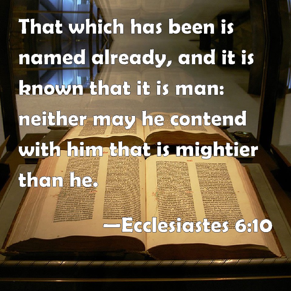 Choose a Background Ecclesiastes 6:10 That which has been is named already, and it is known that it is man: neither may he contend with him that is mightier than he. KJV: That which hath been is named already, and it is known that it is man: neither may he contend with him that is mightier than he. DRB: He that shall be, his name is already called: and it is known, that he is man, and cannot contend in judgment with him that is stronger than himself. DBT: That which is hath already been named; and what man is, is known, and that he cannot contend with him that is mightier than he. ERV: Whatsoever hath been, the name thereof was given long ago, and it is known that it is man: neither can he contend with him that is mightier than he. WBT: That which hath been is named already, and it is known that it is man: neither may he contend with him that is mightier than he. WEB: Whatever has been, its name was given long ago; and it is known what man is; neither can he contend with him who is mightier than he. YLT: What is that which hath been? already is its name called, and it is known that it is man, and he is not able to contend with him who is stronger than he.Links Ecclesiastes 6:10 NIV • Ecclesiastes 6:10 NLT • Ecclesiastes 6:10 ESV • Ecclesiastes 6:10 NASB • Ecclesiastes 6:10 KJV • Ecclesiastes 6:10 Interlinear • Ecclesiastes 6:10 Commentaries • Ecclesiastes 6:10 Parallel Texts • Ecclesiastes 6:10 Bible Apps • Ecclesiastes 6:10 Parallel • Bible Hub |
