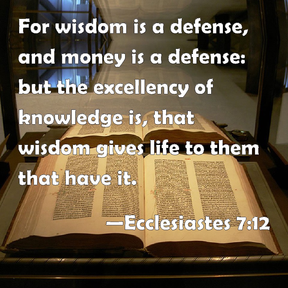 Choose a Background Ecclesiastes 7:12 For wisdom is a defense, and money is a defense: but the excellency of knowledge is, that wisdom gives life to them that have it. KJV: For wisdom is a defence, and money is a defence: but the excellency of knowledge is, that wisdom giveth life to them that have it. DRB: For as wisdom is a defence, so money is a defence : but learning and wisdom excel in this, that they give life to him that possesseth them. DBT: For wisdom is a defence as money is a defence; but the excellency of knowledge is, that wisdom maketh them that possess it to live. ERV: For wisdom is a defence, even as money is a defence: but the excellency of knowledge is, that wisdom preserveth the life of him that hath it. WBT: For wisdom is a defense, and money is a defense: but the excellence of knowledge is, that wisdom giveth life to them that have it. WEB: For wisdom is a defense, even as money is a defense; but the excellency of knowledge is that wisdom preserves the life of him who has it. YLT: For wisdom is a defense, money is a defence, And the advantage of the knowledge of wisdom is, She reviveth her possessors.Links Ecclesiastes 7:12 NIV • Ecclesiastes 7:12 NLT • Ecclesiastes 7:12 ESV • Ecclesiastes 7:12 NASB • Ecclesiastes 7:12 KJV • Ecclesiastes 7:12 Interlinear • Ecclesiastes 7:12 Commentaries • Ecclesiastes 7:12 Parallel Texts • Ecclesiastes 7:12 Bible Apps • Ecclesiastes 7:12 Parallel • Bible Hub |