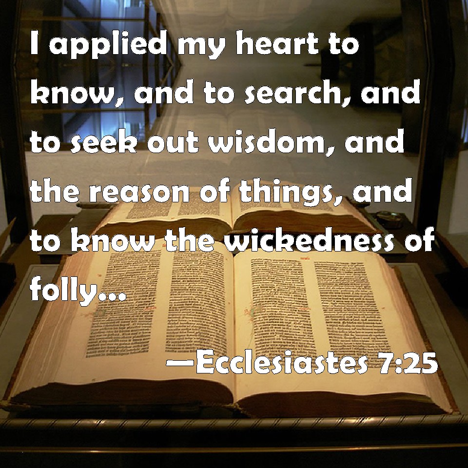 Choose a Background Ecclesiastes 7:25 I applied my heart to know, and to search, and to seek out wisdom, and the reason of things, and to know the wickedness of folly, even of foolishness and madness: KJV: I applied mine heart to know, and to search, and to seek out wisdom, and the reason of things, and to know the wickedness of folly, even of foolishness and madness: DRB: I have surveyed all things with my mind, to know, and consider, and seek out wisdom and reason: and to know the wickedness of the fool, and the error of the imprudent: DBT: I turned, I and my heart, to know, and to search, and to seek out wisdom and reason, and to know wickedness to be folly, and foolishness to be madness; ERV: I turned about, and my heart was set to know and to search out, and to seek wisdom and the reason of things, and to know that wickedness is folly, and that foolishness is madness: WBT: I applied my heart to know, and to search, and to seek out wisdom, and the reason of things, and to know the wickedness of folly, even of foolishness and madness: WEB: I turned around, and my heart sought to know and to search out, and to seek wisdom and the scheme of things, and to know that wickedness is stupidity, and that foolishness is madness. YLT: I have turned round, also my heart, to know and to search, and to seek out wisdom, and reason, and to know the wrong of folly, and of foolishness the madness.Links Ecclesiastes 7:25 NIV • Ecclesiastes 7:25 NLT • Ecclesiastes 7:25 ESV • Ecclesiastes 7:25 NASB • Ecclesiastes 7:25 KJV • Ecclesiastes 7:25 Interlinear • Ecclesiastes 7:25 Commentaries • Ecclesiastes 7:25 Parallel Texts • Ecclesiastes 7:25 Bible Apps • Ecclesiastes 7:25 Parallel • Bible Hub |
