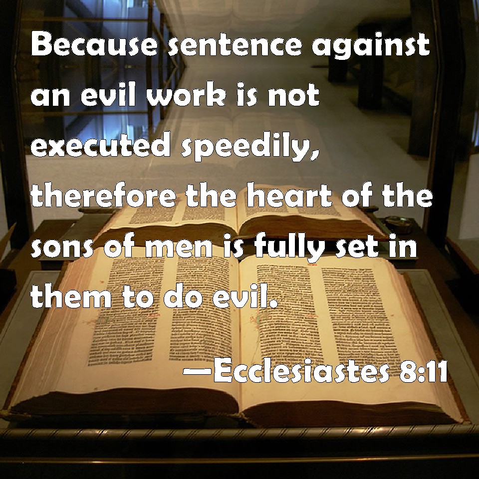 Ecclesiastes 8:11 Because sentence against an evil work is not executed speedily, therefore the heart of the sons of men is fully set in them to do evil.