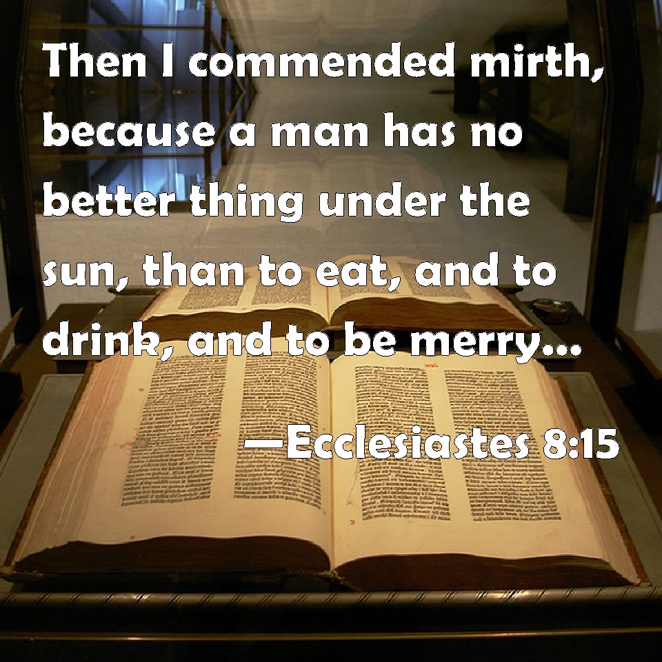 Choose a Background Ecclesiastes 8:15 Then I commended mirth, because a man has no better thing under the sun, than to eat, and to drink, and to be merry: for that shall abide with him of his labor the days of his life, which God gives him under the sun. KJV: Then I commended mirth, because a man hath no better thing under the sun, than to eat, and to drink, and to be merry: for that shall abide with him of his labour the days of his life, which God giveth him under the sun. DRB: Therefore I commended mirth, because there was no good for a man under the sun, but to eat, and drink, and be merry, and that he should take nothing else with him of his labour in the days of his life, which God hath given him under the sun. DBT: And I commended mirth, because there is nothing better for man under the sun than to eat, and to drink, and to be merry; for that shall abide with him of his labour the days of his life, which God hath given him under the sun. ERV: Then I commended mirth, because a man hath no better thing under the sun, than to eat, and to drink, and to be merry: for that shall abide with him in his labour all the days of his life which God hath given him under the sun. WBT: Then I commended mirth, because a man hath no better thing under the sun, than to eat, and to drink, and to be merry: for that shall abide with him of his labor the days of his life, which God giveth him under the sun. WEB: Then I commended mirth, because a man has no better thing under the sun, than to eat, and to drink, and to be joyful: for that will accompany him in his labor all the days of his life which God has given him under the sun. YLT: And I have praised mirth because there is no good to man under the sun except to eat and to drink, and to rejoice, and it remaineth with him of his labour the days of his life that God hath given to him under the sun.Links Ecclesiastes 8:15 NIV • Ecclesiastes 8:15 NLT • Ecclesiastes 8:15 ESV • Ecclesiastes 8:15 NASB • Ecclesiastes 8:15 KJV • Ecclesiastes 8:15 Interlinear • Ecclesiastes 8:15 Commentaries • Ecclesiastes 8:15 Parallel Texts • Ecclesiastes 8:15 Bible Apps • Ecclesiastes 8:15 Parallel • Bible Hub |