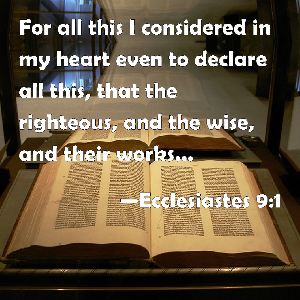 Choose a Background Ecclesiastes 9:1 For all this I considered in my heart even to declare all this, that the righteous, and the wise, and their works, are in the hand of God: no man knows either love or hatred by all that is before them. KJV: For all this I considered in my heart even to declare all this, that the righteous, and the wise, and their works, are in the hand of God: no man knoweth either love or hatred by all that is before them. DRB: All these things have I considered in my heart, that I might carefully understand them: there are just men and wise men, and their works are in the hand of God: and yet man knoweth not whether he be worthy of love, or hatred: DBT: For all this I laid to my heart and indeed to investigate all this, that the righteous, and the wise, and their works, are in the hand of God; man knoweth neither love nor hatred: all is before them. ERV: For all this I laid to my heart, even to explore all this; that the righteous, and the wise, and their works, are in the hand of God: whether it be love or hatred, man knoweth it not; all is before them. WBT: For all this I considered in my heart even to declare all this, that the righteous, and the wise, and their works, are in the hand of God: no man knoweth either love or hatred by all that is before them. WEB: For all this I laid to my heart, even to explore all this: that the righteous, and the wise, and their works, are in the hand of God; whether it is love or hatred, man doesn't know it; all is before them. YLT: But all this I have laid unto my heart, so as to clear up the whole of this, that the righteous and the wise, and their works, are in the hand of God, neither love nor hatred doth man know, the whole is before them.Links Ecclesiastes 9:1 NIV • Ecclesiastes 9:1 NLT • Ecclesiastes 9:1 ESV • Ecclesiastes 9:1 NASB • Ecclesiastes 9:1 KJV • Ecclesiastes 9:1 Interlinear • Ecclesiastes 9:1 Commentaries • Ecclesiastes 9:1 Parallel Texts • Ecclesiastes 9:1 Bible Apps • Ecclesiastes 9:1 Parallel • Bible Hub |