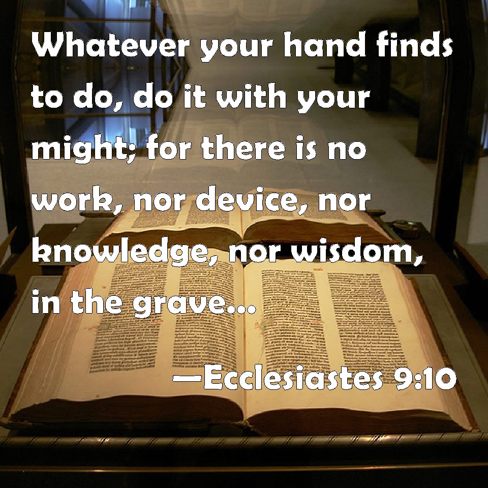 Choose a Background Ecclesiastes 9:10 Whatever your hand finds to do, do it with your might; for there is no work, nor device, nor knowledge, nor wisdom, in the grave, where you go. KJV: Whatsoever thy hand findeth to do, do it with thy might; for there is no work, nor device, nor knowledge, nor wisdom, in the grave, whither thou goest. DRB: Whatsoever thy hand is able to do, do it earnestly: for neither work, nor reason, nor wisdom, nor knowledge shall be in hell, whither thou art hastening. DBT: Whatever thy hand findeth to do, do with thy might; for there is no work, nor device, nor knowledge, nor wisdom, in Sheol, whither thou goest. ERV: Whatsoever thy hand findeth to do, do it with thy might; for there is no work, nor device, nor knowledge, nor wisdom, in the grave, whither thou goest. WBT: Whatever thy hand findeth to do, do it with thy might; for there is no work, nor device, nor knowledge, nor wisdom, in the grave, whither thou goest. WEB: Whatever your hand finds to do, do it with your might; for there is no work, nor device, nor knowledge, nor wisdom, in Sheol, where you are going. YLT: All that thy hand findeth to do, with thy power do, for there is no work, and device, and knowledge, and wisdom in Sheol whither thou art going.Links Ecclesiastes 9:10 NIV • Ecclesiastes 9:10 NLT • Ecclesiastes 9:10 ESV • Ecclesiastes 9:10 NASB • Ecclesiastes 9:10 KJV • Ecclesiastes 9:10 Interlinear • Ecclesiastes 9:10 Commentaries • Ecclesiastes 9:10 Parallel Texts • Ecclesiastes 9:10 Bible Apps • Ecclesiastes 9:10 Parallel • Bible Hub |