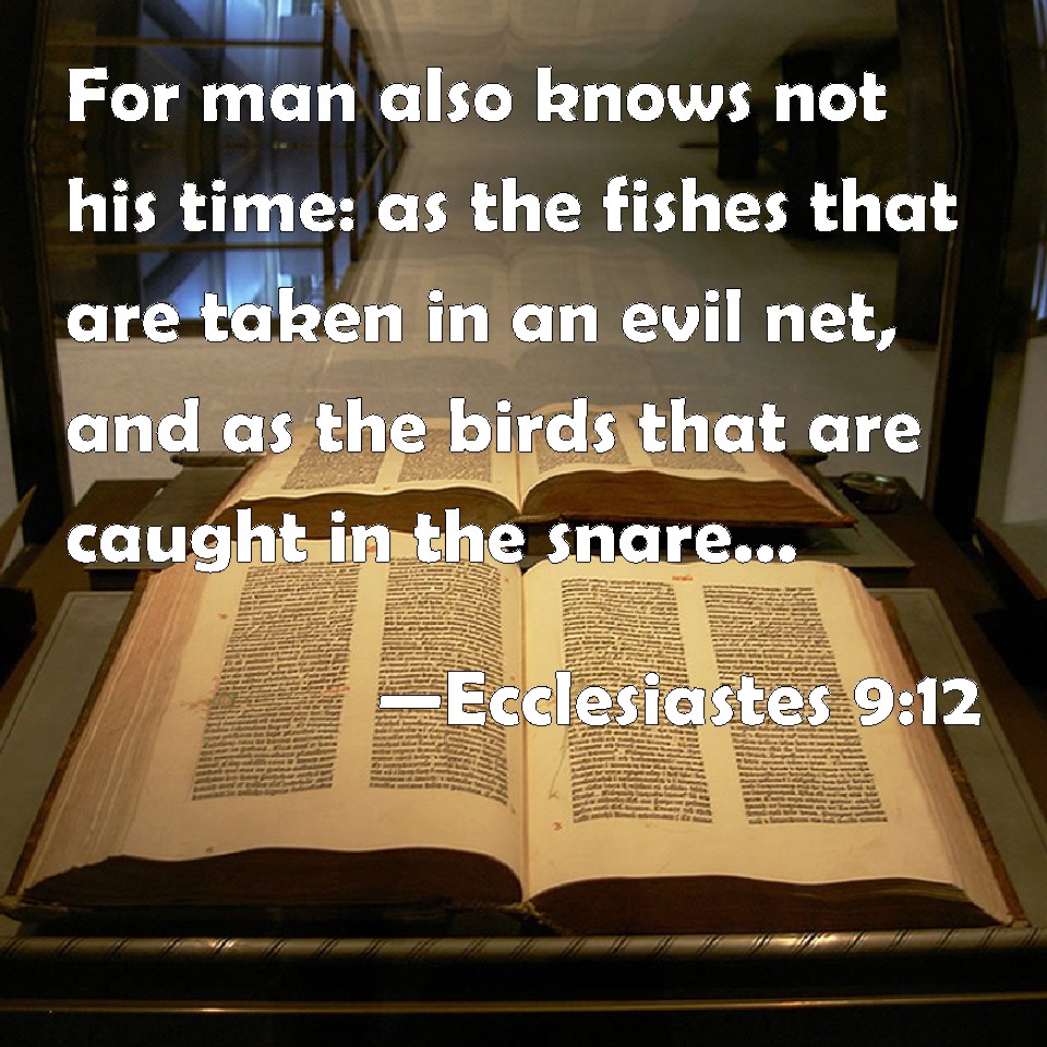 Choose a Background Ecclesiastes 9:12 For man also knows not his time: as the fishes that are taken in an evil net, and as the birds that are caught in the snare; so are the sons of men snared in an evil time, when it falls suddenly on them. KJV: For man also knoweth not his time: as the fishes that are taken in an evil net, and as the birds that are caught in the snare; so are the sons of men snared in an evil time, when it falleth suddenly upon them. DRB: Man knoweth not his own end: but as fishes are taken with the hook, and as birds are caught with the snare, so men are taken in the evil time, when it shall suddenly come upon them. DBT: For man also knoweth not his time: as the fishes that are taken in an evil net, and as the birds that are taken with the snare, like them are the children of men snared in an evil time, when it falleth suddenly upon them. ERV: For man also knoweth not his time: as the fishes that are taken in an evil net, and as the birds that are caught in the snare, even so, are the sons of men snared in an evil time, when it falleth suddenly upon them. WBT: For man also knoweth not his time: as the fishes that are taken in an evil net, and as the birds that are caught in the snare; so are the sons of men snared in an evil time, when it falleth suddenly upon them. WEB: For man also doesn't know his time. As the fish that are taken in an evil net, and as the birds that are caught in the snare, even so are the sons of men snared in an evil time, when it falls suddenly on them. YLT: For even man knoweth not his time; as fish that are taken hold of by an evil net, and as birds that are taken hold of by a snare, like these are the sons of man snared at an evil time, when it falleth upon them suddenly.Links Ecclesiastes 9:12 NIV • Ecclesiastes 9:12 NLT • Ecclesiastes 9:12 ESV • Ecclesiastes 9:12 NASB • Ecclesiastes 9:12 KJV • Ecclesiastes 9:12 Interlinear • Ecclesiastes 9:12 Commentaries • Ecclesiastes 9:12 Parallel Texts • Ecclesiastes 9:12 Bible Apps • Ecclesiastes 9:12 Parallel • Bible Hub |