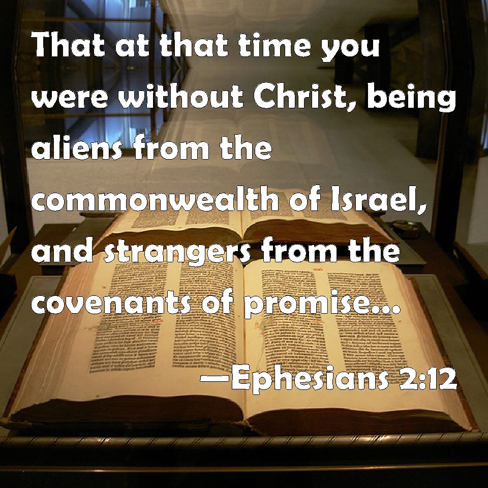 Choose a Background Ephesians 2:12 That at that time you were without Christ, being aliens from the commonwealth of Israel, and strangers from the covenants of promise, having no hope, and without God in the world: KJV: That at that time ye were without Christ, being aliens from the commonwealth of Israel, and strangers from the covenants of promise, having no hope, and without God in the world: DRB: That you were at that time without Christ, being aliens from the conversation of Israel, and strangers to the testament, having no hope of the promise, and without God in this world. DBT: that ye were at that time without Christ, aliens from the commonwealth of Israel, and strangers to the covenants of promise, having no hope, and without God in the world: ERV: that ye were at that time separate from Christ, alienated from the commonwealth of Israel, and strangers from the covenants of the promise, having no hope and without God in the world. WBT: That at that time ye were without Christ, being aliens from the commonwealth of Israel, and strangers from the covenants of promise, having no hope, and without God in the world: WEB: that you were at that time separate from Christ, alienated from the commonwealth of Israel, and strangers from the covenants of the promise, having no hope and without God in the world. YLT: that ye were at that time apart from Christ, having been alienated from the commonwealth of Israel, and strangers to the covenants of the promise, having no hope, and without God, in the world;Links Ephesians 2:12 NIV • Ephesians 2:12 NLT • Ephesians 2:12 ESV • Ephesians 2:12 NASB • Ephesians 2:12 KJV • Ephesians 2:12 Interlinear • Ephesians 2:12 Commentaries • Ephesians 2:12 Parallel Texts • Ephesians 2:12 Bible Apps • Ephesians 2:12 Parallel • Bible Hub |