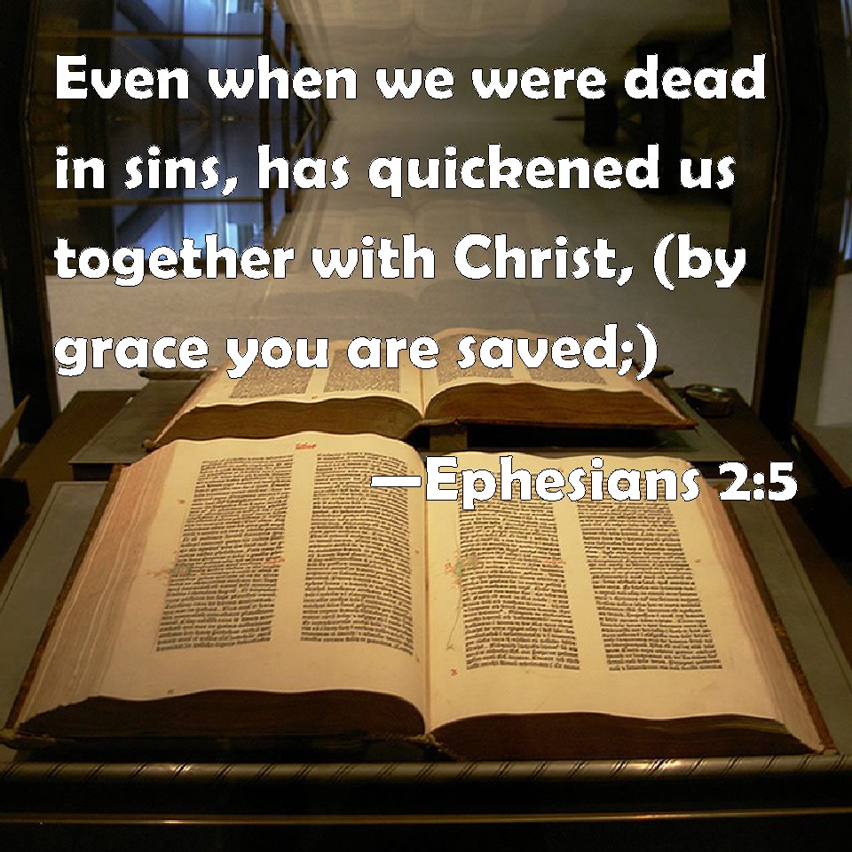 Choose a Background Ephesians 2:5 Even when we were dead in sins, has quickened us together with Christ, (by grace you are saved;) KJV: Even when we were dead in sins, hath quickened us together with Christ, (by grace ye are saved;) DRB: Even when we were dead in sins, hath quickened us together in Christ, (by whose grace you are saved,) DBT: (we too being dead in offences,) has quickened us with the Christ, (ye are saved by grace,) ERV: even when we were dead through our trespasses, quickened us together with Christ (by grace have ye been saved), WBT: Even when we were dead in sins, hath made us alive together with Christ, (by grace ye are saved;) WEB: even when we were dead through our trespasses, made us alive together with Christ (by grace you have been saved), YLT: even being dead in the trespasses, did make us to live together with the Christ, (by grace ye are having been saved,)Links Ephesians 2:5 NIV • Ephesians 2:5 NLT • Ephesians 2:5 ESV • Ephesians 2:5 NASB • Ephesians 2:5 KJV • Ephesians 2:5 Interlinear • Ephesians 2:5 Commentaries • Ephesians 2:5 Parallel Texts • Ephesians 2:5 Bible Apps • Ephesians 2:5 Parallel • Bible Hub |