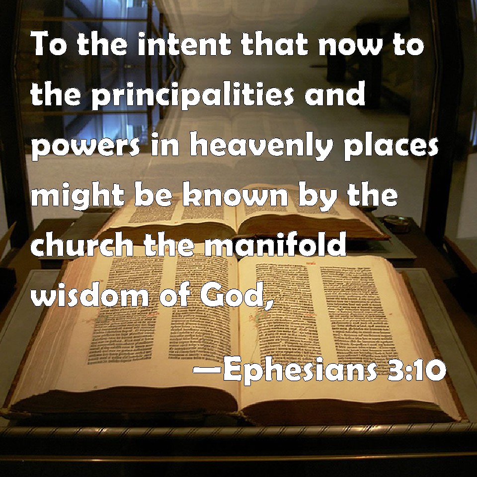Choose a Background Ephesians 3:10 To the intent that now to the principalities and powers in heavenly places might be known by the church the manifold wisdom of God, KJV: To the intent that now unto the principalities and powers in heavenly places might be known by the church the manifold wisdom of God, DRB: That the manifold wisdom of God may be made known to the principalities and powers in heavenly places through the church, DBT: in order that now to the principalities and authorities in the heavenlies might be made known through the assembly the all-various wisdom of God, ERV: to the intent that now unto the principalities and the powers in the heavenly places might be made known through the church the manifold wisdom of God, WBT: To the intent that now to the principalities and powers in heavenly places might be known by the church the manifold wisdom of God, WEB: to the intent that now through the assembly the manifold wisdom of God might be made known to the principalities and the powers in the heavenly places, YLT: that there might be made known now to the principalities and the authorities in the heavenly places, through the assembly, the manifold wisdom of God,Links Ephesians 3:10 NIV • Ephesians 3:10 NLT • Ephesians 3:10 ESV • Ephesians 3:10 NASB • Ephesians 3:10 KJV • Ephesians 3:10 Interlinear • Ephesians 3:10 Commentaries • Ephesians 3:10 Parallel Texts • Ephesians 3:10 Bible Apps • Ephesians 3:10 Parallel • Bible Hub |