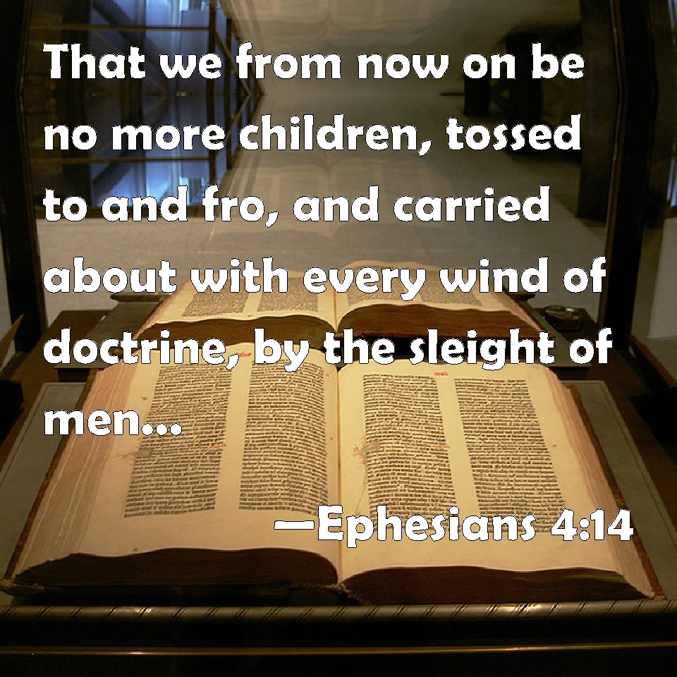 Choose a Background Ephesians 4:14 That we from now on be no more children, tossed to and fro, and carried about with every wind of doctrine, by the sleight of men, and cunning craftiness, whereby they lie in wait to deceive; KJV: That we henceforth be no more children, tossed to and fro, and carried about with every wind of doctrine, by the sleight of men, and cunning craftiness, whereby they lie in wait to deceive; DRB: That henceforth we be no more children tossed to and fro, and carried about with every wind of doctrine by the wickedness of men, by cunning craftiness, by which they lie in wait to deceive DBT: in order that we may be no longer babes, tossed and carried about by every wind of that teaching which is in the sleight of men, in unprincipled cunning with a view to systematized error; ERV: that we may be no longer children, tossed to and fro and carried about with every wind of doctrine, by the sleight of men, in craftiness, after the wiles of error; WBT: That we henceforth be no more children, tossed to and fro, and carried about with every wind of doctrine, by the sleight of men, and cunning craftiness, by which they lie in wait to deceive: WEB: that we may no longer be children, tossed back and forth and carried about with every wind of doctrine, by the trickery of men, in craftiness, after the wiles of error; YLT: that we may no more be babes, tossed and borne about by every wind of the teaching, in the sleight of men, in craftiness, unto the artifice of leading astray,Links Ephesians 4:14 NIV • Ephesians 4:14 NLT • Ephesians 4:14 ESV • Ephesians 4:14 NASB • Ephesians 4:14 KJV • Ephesians 4:14 Interlinear • Ephesians 4:14 Commentaries • Ephesians 4:14 Parallel Texts • Ephesians 4:14 Bible Apps • Ephesians 4:14 Parallel • Bible Hub |