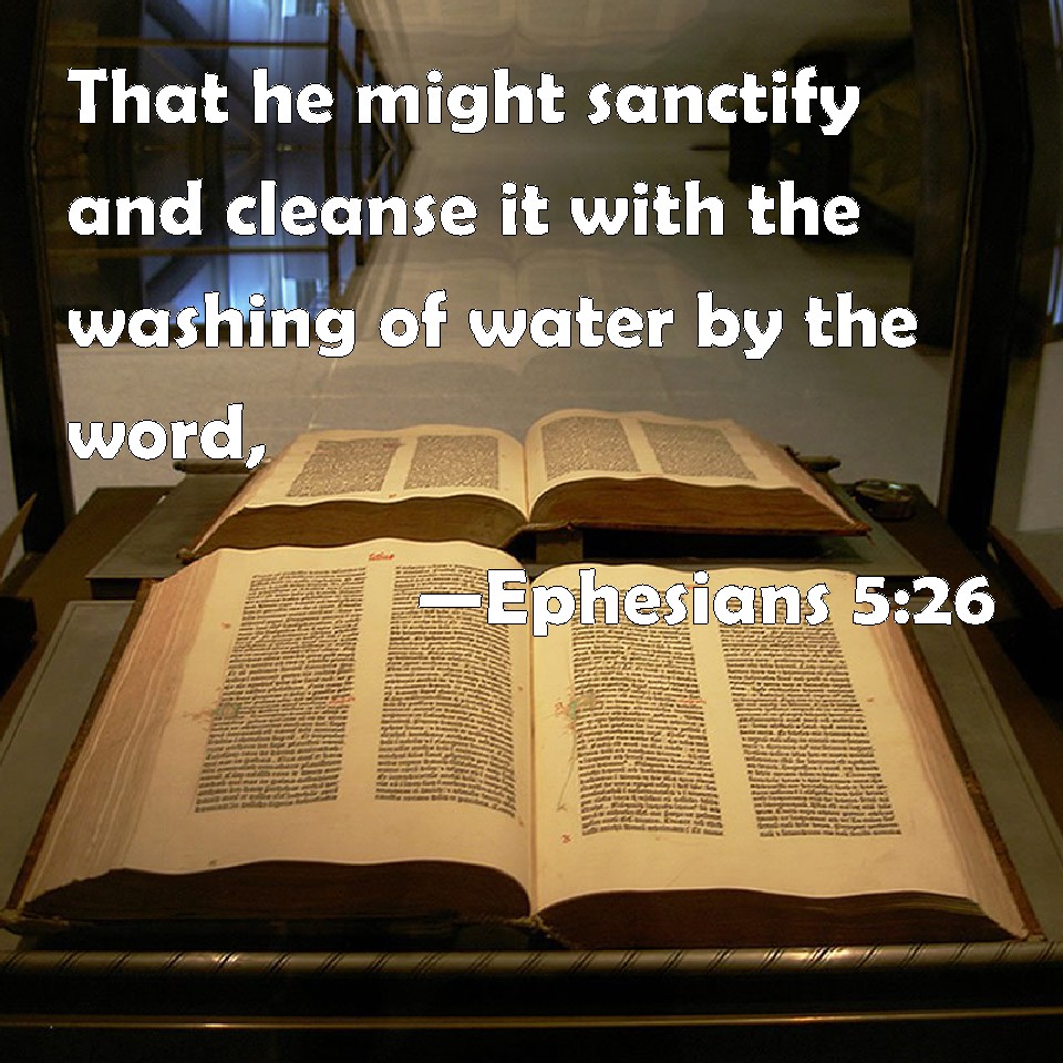 Choose a Background Ephesians 5:26 That he might sanctify and cleanse it with the washing of water by the word, KJV: That he might sanctify and cleanse it with the washing of water by the word, DRB: That he might sanctify it, cleansing it by the laver of water in the word of life: DBT: in order that he might sanctify it, purifying it by the washing of water by the word, ERV: that he might sanctify it, having cleansed it by the washing of water with the word, WBT: That he might sanctify and cleanse it with the washing of water by the word, WEB: that he might sanctify it, having cleansed it by the washing of water with the word, YLT: that he might sanctify it, having cleansed it with the bathing of the water in the saying,Links Ephesians 5:26 NIV • Ephesians 5:26 NLT • Ephesians 5:26 ESV • Ephesians 5:26 NASB • Ephesians 5:26 KJV • Ephesians 5:26 Interlinear • Ephesians 5:26 Commentaries • Ephesians 5:26 Parallel Texts • Ephesians 5:26 Bible Apps • Ephesians 5:26 Parallel • Bible Hub |