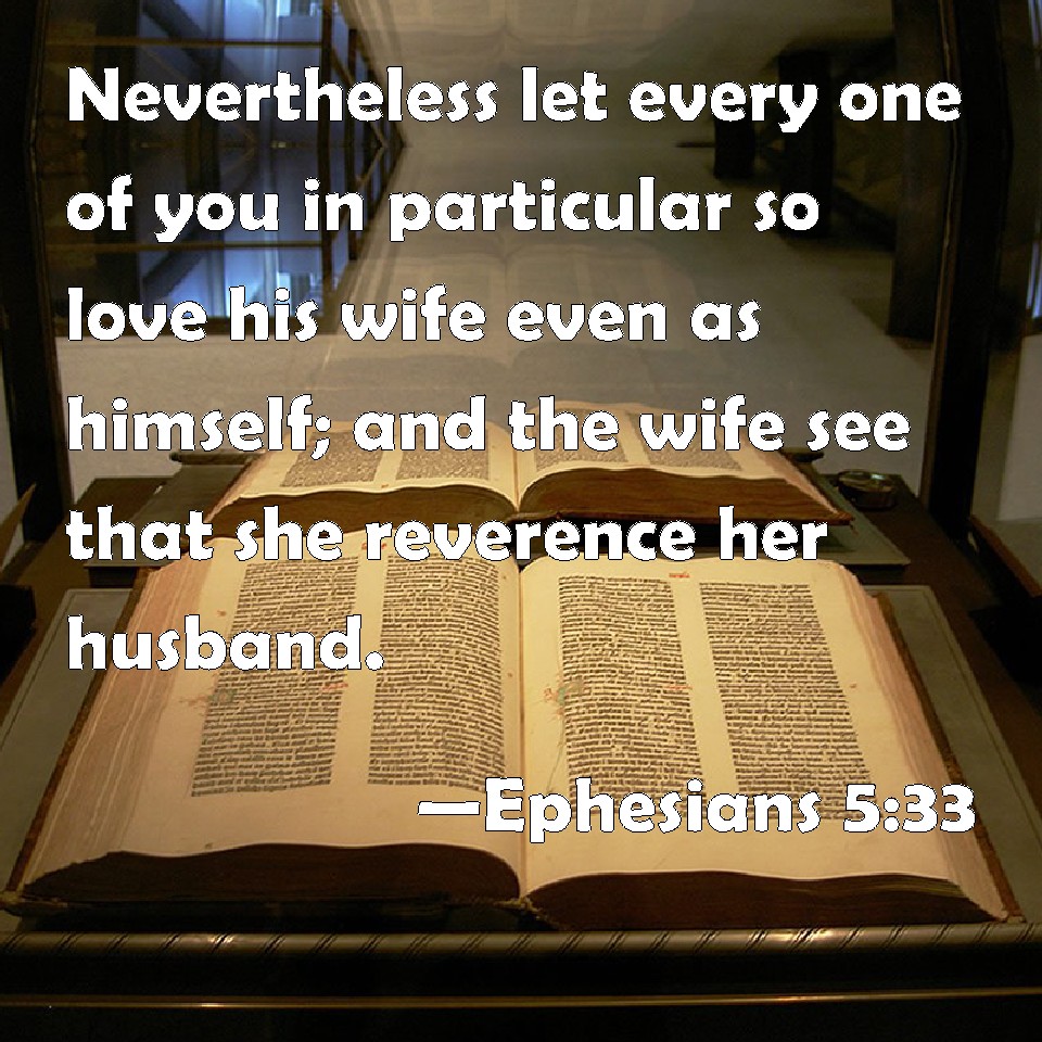 Ephesians 5:33 Nevertheless let every one of you in particular so love his wife even as himself; and the wife see that she reverence her husband.