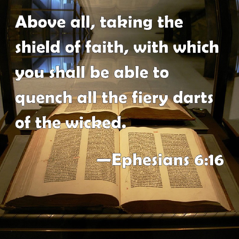 Choose a Background Ephesians 6:16 Above all, taking the shield of faith, with which you shall be able to quench all the fiery darts of the wicked. KJV: Above all, taking the shield of faith, wherewith ye shall be able to quench all the fiery darts of the wicked. DRB: In all things taking the shield of faith, wherewith you may be able to extinguish all the fiery darts of the most wicked one. DBT: besides all these, having taken the shield of faith with which ye will be able to quench all the inflamed darts of the wicked one. ERV: withal taking up the shield of faith, wherewith ye shall be able to quench all the fiery darts of the evil one. WBT: Above all, taking the shield of faith, with which ye will be able to extinguish all the fiery darts of the wicked. WEB: above all, taking up the shield of faith, with which you will be able to quench all the fiery darts of the evil one. YLT: above all, having taken up the shield of the faith, in which ye shall be able all the fiery darts of the evil one to quench,Links Ephesians 6:16 NIV • Ephesians 6:16 NLT • Ephesians 6:16 ESV • Ephesians 6:16 NASB • Ephesians 6:16 KJV • Ephesians 6:16 Interlinear • Ephesians 6:16 Commentaries • Ephesians 6:16 Parallel Texts • Ephesians 6:16 Bible Apps • Ephesians 6:16 Parallel • Bible Hub |