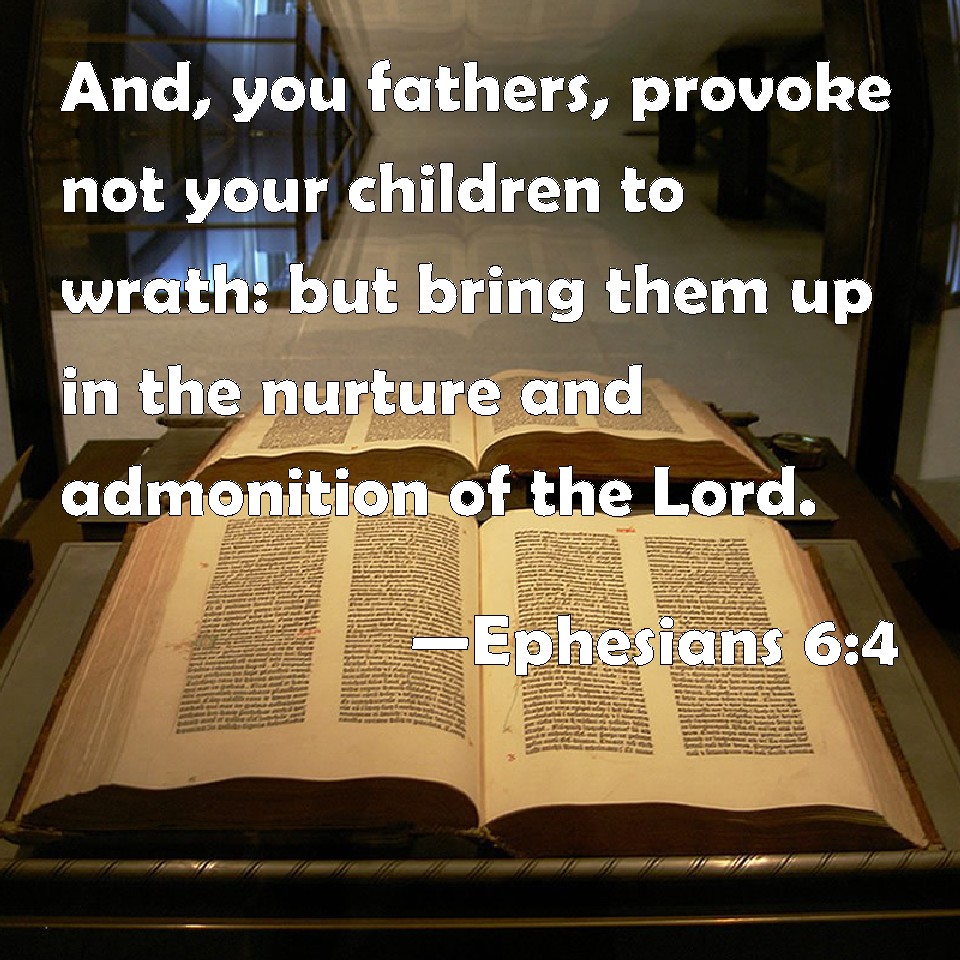 Choose a Background Ephesians 6:4 And, you fathers, provoke not your children to wrath: but bring them up in the nurture and admonition of the Lord. KJV: And, ye fathers, provoke not your children to wrath: but bring them up in the nurture and admonition of the Lord. DRB: And you, fathers, provoke not your children to anger; but bring them up in the discipline and correction of the Lord. DBT: And ye fathers, do not provoke your children to anger, but bring them up in the discipline and admonition of the Lord. ERV: And, ye fathers, provoke not your children to wrath: but nurture them in the chastening and admonition of the Lord. WBT: And, ye fathers, provoke not your children to wrath: but bring them up in the nurture and admonition of the Lord. WEB: You fathers, don't provoke your children to wrath, but nurture them in the discipline and instruction of the Lord. YLT: And the fathers! provoke not your children, but nourish them in the instruction and admonition of the Lord.Links Ephesians 6:4 NIV • Ephesians 6:4 NLT • Ephesians 6:4 ESV • Ephesians 6:4 NASB • Ephesians 6:4 KJV • Ephesians 6:4 Interlinear • Ephesians 6:4 Commentaries • Ephesians 6:4 Parallel Texts • Ephesians 6:4 Bible Apps • Ephesians 6:4 Parallel • Bible Hub |