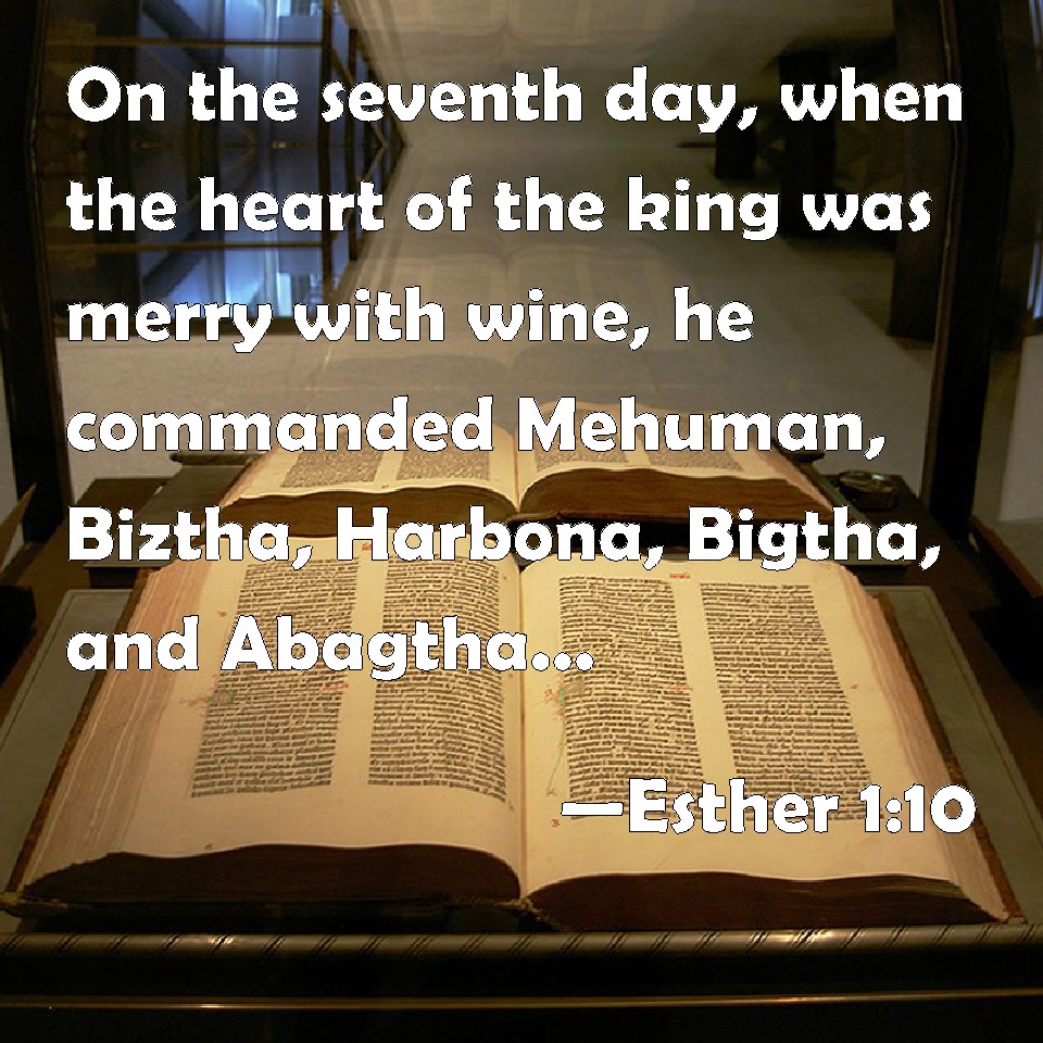 Choose a Background Esther 1:10 On the seventh day, when the heart of the king was merry with wine, he commanded Mehuman, Biztha, Harbona, Bigtha, and Abagtha, Zethar, and Carcas, the seven chamberlains that served in the presence of Ahasuerus the king, KJV: On the seventh day, when the heart of the king was merry with wine, he commanded Mehuman, Biztha, Harbona, Bigtha, and Abagtha, Zethar, and Carcas, the seven chamberlains that served in the presence of Ahasuerus the king, DRB: Now on the seventh day, when the king was merry, and after very much drinking was well warmed with wine, he commanded Mauman, and Bazatha, and Harbona, and Bagatha, and Abgatha, and Zethar, and Charcas, the seven eunuchs that served in his presence, DBT: On the seventh day, when the king's heart was merry with wine, he commanded Mehuman, Biztha, Harbona, Bigtha, and Abagtha, Zethar, and Carcas, the seven chamberlains that served in the presence of king Ahasuerus, ERV: On the seventh day, when the heart of the king was merry with wine, he commanded Mehuman, Biztha, Harbona, Bigtha, and Abagtha, Zethar, and Carcas, the seven chamberlains that ministered in the presence of Ahasuerus the king, WBT: On the seventh day, when the heart of the king was merry with wine, he commanded Mehuman, Biztha, Harbona, Bigtha, and Abagtha, Zethar, and Carcas, the seven chamberlains that served in the presence of Ahasuerus the king, WEB: On the seventh day, when the heart of the king was merry with wine, he commanded Mehuman, Biztha, Harbona, Bigtha, and Abagtha, Zethar, and Carcass, the seven eunuchs who served in the presence of Ahasuerus the king, YLT: On the seventh day, as the heart of the king is glad with wine, he hath said to Mehuman, Biztha, Harbona, Bigtha, and Abagtha, Zethar, and Carcas, the seven eunuchs who are ministering in the presence of the king Ahasuerus,Links Esther 1:10 NIV • Esther 1:10 NLT • Esther 1:10 ESV • Esther 1:10 NASB • Esther 1:10 KJV • Esther 1:10 Interlinear • Esther 1:10 Commentaries • Esther 1:10 Parallel Texts • Esther 1:10 Bible Apps • Esther 1:10 Parallel • Bible Hub |