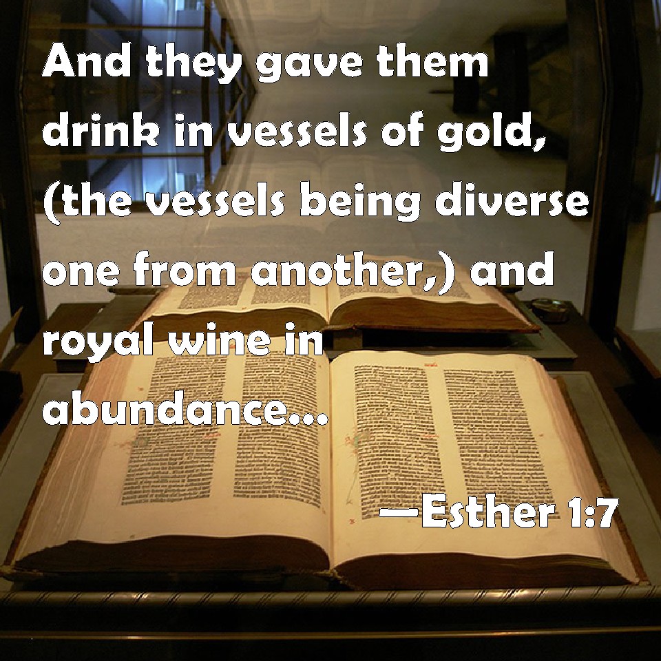 Choose a Background Esther 1:7 And they gave them drink in vessels of gold, (the vessels being diverse one from another,) and royal wine in abundance, according to the state of the king. KJV: And they gave them drink in vessels of gold, (the vessels being diverse one from another,) and royal wine in abundance, according to the state of the king. DRB: And they that were invited, drank in golden cups, and the meats were brought in divers vessels one after another. Wine also in abundance and of the best was presented, as was worthy of a king's magnificence. DBT: And they gave drink in vessels of gold (the vessels being diverse one from another), and royal wine in abundance, according to the king's bounty. ERV: And they gave them drink in vessels of gold, (the vessels being diverse one from another,) and royal wine in abundance, according to the bounty of the king. WBT: And they gave them drink in vessels of gold, (the vessels being diverse one from another,) and royal wine in abundance, according to the state of the king. WEB: They gave them drinks in golden vessels of various kinds, including royal wine in abundance, according to the bounty of the king. YLT: and the giving of drink in vessels of gold, and the vessels are divers vessels, and the royal wine is abundant, as a memorial of the king.Links Esther 1:7 NIV • Esther 1:7 NLT • Esther 1:7 ESV • Esther 1:7 NASB • Esther 1:7 KJV • Esther 1:7 Interlinear • Esther 1:7 Commentaries • Esther 1:7 Parallel Texts • Esther 1:7 Bible Apps • Esther 1:7 Parallel • Bible Hub |