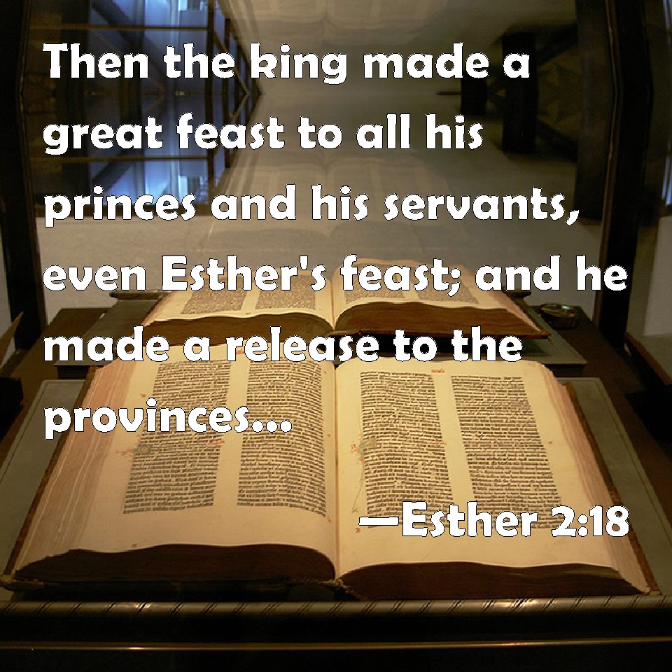 Choose a Background Esther 2:18 Then the king made a great feast to all his princes and his servants, even Esther's feast; and he made a release to the provinces, and gave gifts, according to the state of the king. KJV: Then the king made a great feast unto all his princes and his servants, even Esther's feast; and he made a release to the provinces, and gave gifts, according to the state of the king. DRB: And he commanded a magnificent feast to be prepared for all the princes, and for his servants, for the marriage and wedding of Esther. And he gave rest to all the provinces, and bestowed gifts according to princely magnificence. DBT: And the king made a great feast to all his princes and his servants, Esther's feast; and he made a release to the provinces, and gave presents according to the king's bounty. ERV: Then the king made a great feast unto all his princes and his servants, even Esther's feast; and he made a release to the provinces, and gave gifts, according to the bounty of the king. WBT: Then the king made a great feast to all his princes and his servants, even Esther's feast; and he made a release to the provinces, and gave gifts, according to the state of the king. WEB: Then the king made a great feast for all his princes and his servants, even Esther's feast; and he proclaimed a holiday in the provinces, and gave gifts according to the king's bounty. YLT: and the king maketh a great banquet to all his heads and his servants — the banquet of Esther — and a release to the provinces hath made, and giveth gifts as a memorial of the king.Links Esther 2:18 NIV • Esther 2:18 NLT • Esther 2:18 ESV • Esther 2:18 NASB • Esther 2:18 KJV • Esther 2:18 Interlinear • Esther 2:18 Commentaries • Esther 2:18 Parallel Texts • Esther 2:18 Bible Apps • Esther 2:18 Parallel • Bible Hub |