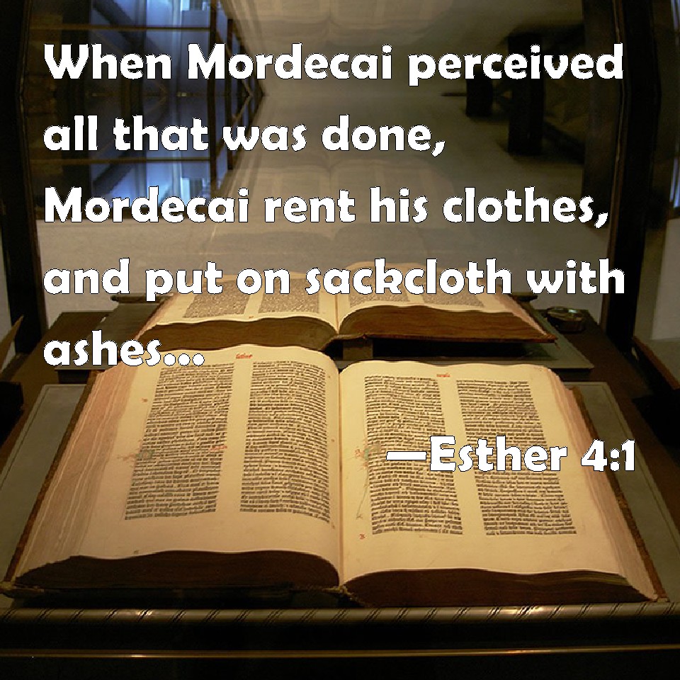 Choose a Background Esther 4:1 When Mordecai perceived all that was done, Mordecai rent his clothes, and put on sackcloth with ashes, and went out into the middle of the city, and cried with a loud and a bitter cry; KJV: When Mordecai perceived all that was done, Mordecai rent his clothes, and put on sackcloth with ashes, and went out into the midst of the city, and cried with a loud and a bitter cry; DRB: Now when Mardochai had heard these things, he rent his garments, and put on sackcloth, strewing ashes on his head: and he cried with a loud voice in the street in the midst of the city, shewing the anguish of his mind. DBT: And when Mordecai knew all that was done, Mordecai rent his garments, and put on sackcloth with ashes, and went out into the midst of the city, and cried with a loud and bitter cry, ERV: Now when Mordecai knew all that was done, Mordecai rent his clothes, and put on sackcloth with ashes, and went out into the midst of the city, and cried with a loud and a bitter cry: WBT: When Mordecai perceived all that was done, Mordecai rent his clothes, and put on sackcloth with ashes, and went out into the midst of the city, and cried with a loud and a bitter cry; WEB: Now when Mordecai found out all that was done, Mordecai tore his clothes, and put on sackcloth with ashes, and went out into the midst of the city, and wailed loudly and a bitterly. YLT: And Mordecai hath known all that hath been done, and Mordecai rendeth his garments, and putteth on sackcloth and ashes, and goeth forth into the midst of the city and crieth — a cry loud and bitter,Links Esther 4:1 NIV • Esther 4:1 NLT • Esther 4:1 ESV • Esther 4:1 NASB • Esther 4:1 KJV • Esther 4:1 Interlinear • Esther 4:1 Commentaries • Esther 4:1 Parallel Texts • Esther 4:1 Bible Apps • Esther 4:1 Parallel • Bible Hub |