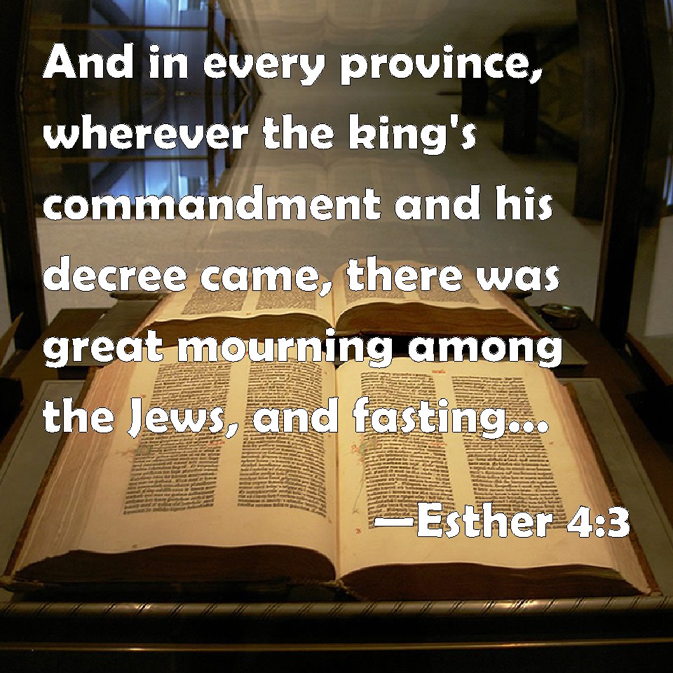 Esther 4:3 And in every province, wherever the king's commandment and his decree came, there was great mourning among the Jews, and fasting, and weeping, and wailing; and many lay in sackcloth and ashes.
