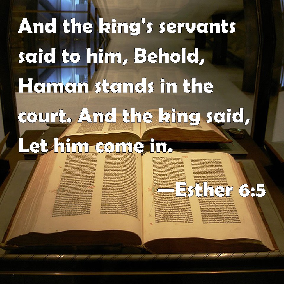 Choose a Background Esther 6:5 And the king's servants said to him, Behold, Haman stands in the court. And the king said, Let him come in. KJV: And the king's servants said unto him, Behold, Haman standeth in the court. And the king said, Let him come in. DRB: The servants answered: Aman standeth in the court, and the king said: Let him come in. DBT: And the king's servants said to him, Behold, Haman is standing in the court. And the king said, Let him come in. ERV: And the king's servants said unto him, Behold, Haman standeth in the court. And the king said, Let him come in. WBT: And the king's servants said to him, Behold, Haman standeth in the court. And the king said, Let him come in. WEB: The king's servants said to him, "Behold, Haman stands in the court." The king said, "Let him come in." YLT: and the servants of the king say unto him, 'Lo, Haman is standing in the court;' and the king saith, 'Let him come in.'Links Esther 6:5 NIV • Esther 6:5 NLT • Esther 6:5 ESV • Esther 6:5 NASB • Esther 6:5 KJV • Esther 6:5 Interlinear • Esther 6:5 Commentaries • Esther 6:5 Parallel Texts • Esther 6:5 Bible Apps • Esther 6:5 Parallel • Bible Hub |