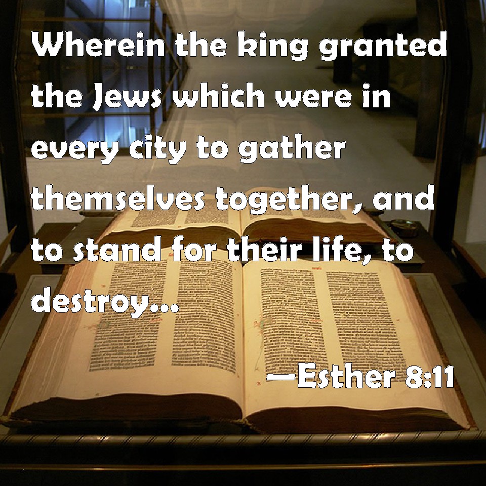 Esther 8:11 Wherein the king granted the Jews which were in every city to gather themselves together, and to stand for their life, to destroy, to slay and to cause to perish, all the power of the people and province that would assault them, both little ones and women, and to take the spoil of them for a prey,