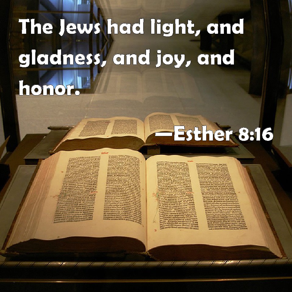 Choose a Background Esther 8:16 The Jews had light, and gladness, and joy, and honor. KJV: The Jews had light, and gladness, and joy, and honour. DRB: But to the Jews a new light seemed to rise, joy, honour, and dancing. DBT: The Jews had light, and joy, and gladness, and honour. ERV: The Jews had light and gladness, and joy and honour. WBT: The Jews had light, and gladness, and joy, and honor. WEB: The Jews had light, gladness, joy, and honor. YLT: to the Jews hath been light, and gladness, and joy, and honour,Links Esther 8:16 NIV • Esther 8:16 NLT • Esther 8:16 ESV • Esther 8:16 NASB • Esther 8:16 KJV • Esther 8:16 Interlinear • Esther 8:16 Commentaries • Esther 8:16 Parallel Texts • Esther 8:16 Bible Apps • Esther 8:16 Parallel • Bible Hub |