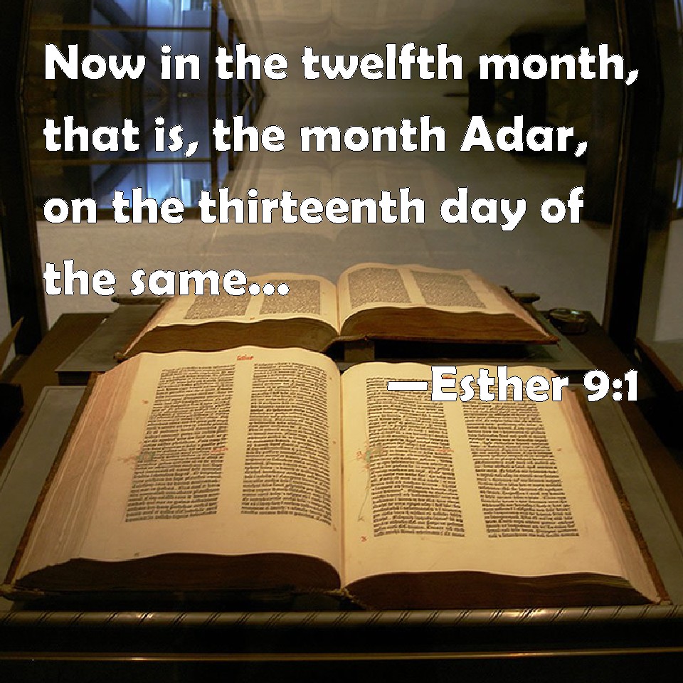 Choose a Background Esther 9:1 Now in the twelfth month, that is, the month Adar, on the thirteenth day of the same, when the king's commandment and his decree drew near to be put in execution, in the day that the enemies of the Jews hoped to have power over them, (though it was turned to the contrary, that the Jews had rule over them that hated them;) KJV: Now in the twelfth month, that is, the month Adar, on the thirteenth day of the same, when the king's commandment and his decree drew near to be put in execution, in the day that the enemies of the Jews hoped to have power over them, (though it was turned to the contrary, that the Jews had rule over them that hated them;) DRB: So on the thirteenth day of the twelfth month, which as we have said above is called Adar, when all the Jews were designed to be massacred, and their enemies were greedy after their blood, the case being altered, the Jews began to have the upper hand, and to revenge themselves of their adversaries. DBT: And in the twelfth month, that is, the month Adar, on the thirteenth day thereof, when the king's commandment and his decree drew near to be put in execution, in the day that the enemies of the Jews hoped to have power over them (but it was turned to the contrary, that the Jews had power over them that hated them), ERV: Now in the twelfth month, which is the month Adar, on the thirteenth day of the same, when the king's commandment and his decree drew near to be put in execution, in the day that the enemies of the Jews hoped to have rule over them; whereas it was turned to the contrary, that the Jews had rule over them that hated them; WBT: Now in the twelfth month, that is, the month Adar, on the thirteenth day of the same, when the king's commandment and his decree drew near to be put in execution, in the day that the enemies of the Jews hoped to have power over them, (though it was turned to the contrary, that the Jews had rule over them that hated them;) WEB: Now in the twelfth month, which is the month Adar, on the thirteenth day of the month, when the king's commandment and his decree drew near to be put in execution, on the day that the enemies of the Jews hoped to conquer them, (but it was turned out the opposite happened, that the Jews conquered those who hated them), YLT: And in the twelfth month — it is the month of Adar — on the thirteenth day of it, in which the word of the king, even his law, hath come to be done, in the day that the enemies of the Jews had hoped to rule over them, and it is turned that the Jews rule over those hating them — Links Esther 9:1 NIV • Esther 9:1 NLT • Esther 9:1 ESV • Esther 9:1 NASB • Esther 9:1 KJV • Esther 9:1 Interlinear • Esther 9:1 Commentaries • Esther 9:1 Parallel Texts • Esther 9:1 Bible Apps • Esther 9:1 Parallel • Bible Hub |