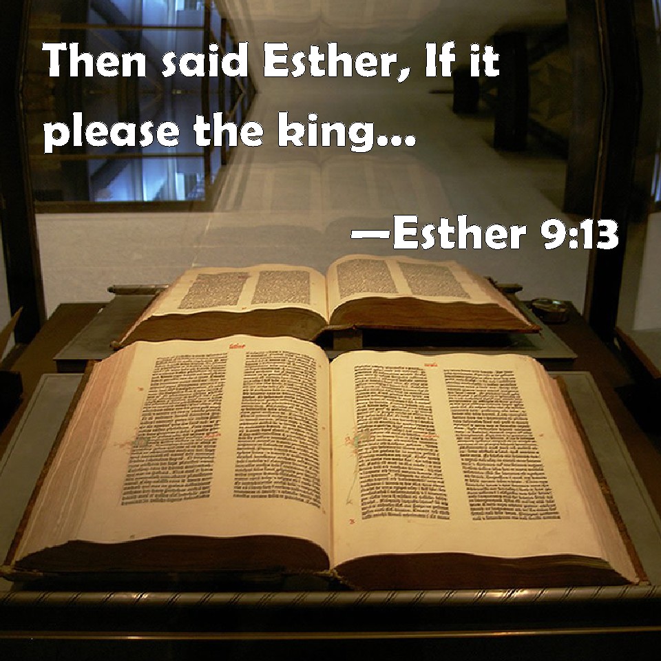 Choose a Background Esther 9:13 Then said Esther, If it please the king, let it be granted to the Jews which are in Shushan to do to morrow also according to this day's decree, and let Haman's ten sons be hanged on the gallows. KJV: Then said Esther, If it please the king, let it be granted to the Jews which are in Shushan to do to morrow also according unto this day's decree, and let Haman's ten sons be hanged upon the gallows. DRB: And she answered: If it please the king, let it be granted to the Jews, to do to morrow in Susan as they have done to day, and that the ten sons of Aman may be hanged upon gibbets. DBT: And Esther said, If it please the king, let it be granted to the Jews that are in Shushan to do to-morrow also according to this day's decree, and let Haman's ten sons be hanged upon the gallows. ERV: Then said Esther, If it please the king, let it be granted to the Jews which are in Shushan to do tomorrow also according unto this day's decree, and let Haman's ten sons be hanged upon the gallows. WBT: Then said Esther, If it shall please the king, let it be granted to the Jews who are in Shushan to do to-morrow also according to this day's decree, and let Haman's ten sons be hanged upon the gallows. WEB: Then Esther said, "If it pleases the king, let it be granted to the Jews who are in Shushan to do tomorrow also according to this day's decree, and let Haman's ten sons be hanged on the gallows." YLT: And Esther saith, 'If to the king it be good, let it be given also to-morrow, to the Jews who are in Shushan, to do according to the law of to-day; and the ten sons of Haman they hang on the tree.'Links Esther 9:13 NIV • Esther 9:13 NLT • Esther 9:13 ESV • Esther 9:13 NASB • Esther 9:13 KJV • Esther 9:13 Interlinear • Esther 9:13 Commentaries • Esther 9:13 Parallel Texts • Esther 9:13 Bible Apps • Esther 9:13 Parallel • Bible Hub |