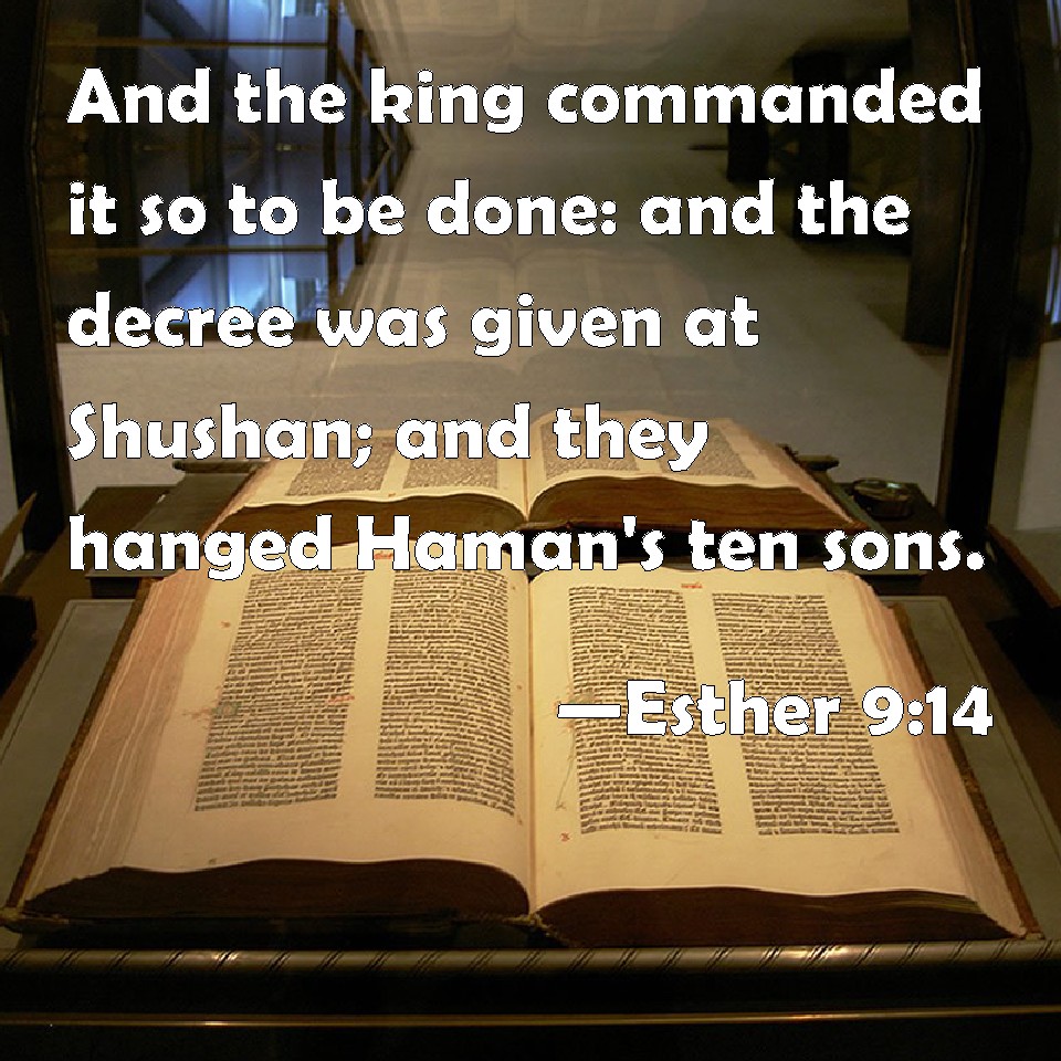 And the king commanded that it should be so done. And forthwith the edict was hung up in Susan, and the ten sons of Aman were hanged.