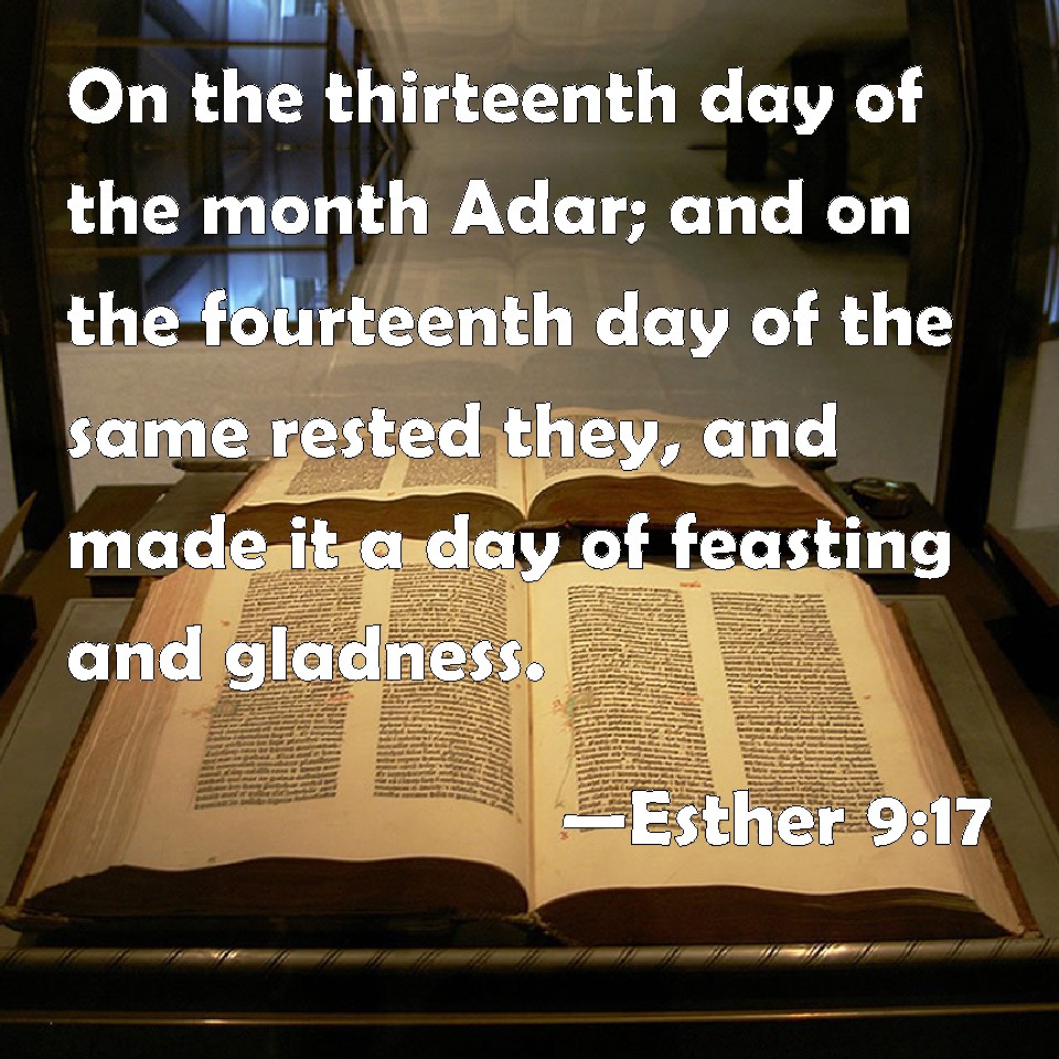 Choose a Background Esther 9:17 On the thirteenth day of the month Adar; and on the fourteenth day of the same rested they, and made it a day of feasting and gladness. KJV: On the thirteenth day of the month Adar; and on the fourteenth day of the same rested they, and made it a day of feasting and gladness. DRB: Now the thirteenth day of the month Adar was the first day with them all of the slaughter, and on the fourteenth day they left off. Which they ordained to be kept holy day, so that all times hereafter they should celebrate it with feasting, joy, and banquets. DBT: on the thirteenth day of the month Adar; and on the fourteenth of the same they rested, and made it a day of feasting and joy. ERV: This was done on the thirteenth day of the month Adar; and on the fourteenth day of the same they rested, and made it a day of feasting and gladness. WBT: On the thirteenth day of the month Adar; and on the fourteenth day of the same they rested, and made it a day of feasting and gladness. WEB: This was done on the thirteenth day of the month Adar; and on the fourteenth day of that month they rested and made it a day of feasting and gladness. YLT: on the thirteenth day of the month of Adar, even to rest on the fourteenth of it, and to make it a day of banquet and of joy.Links Esther 9:17 NIV • Esther 9:17 NLT • Esther 9:17 ESV • Esther 9:17 NASB • Esther 9:17 KJV • Esther 9:17 Interlinear • Esther 9:17 Commentaries • Esther 9:17 Parallel Texts • Esther 9:17 Bible Apps • Esther 9:17 Parallel • Bible Hub |