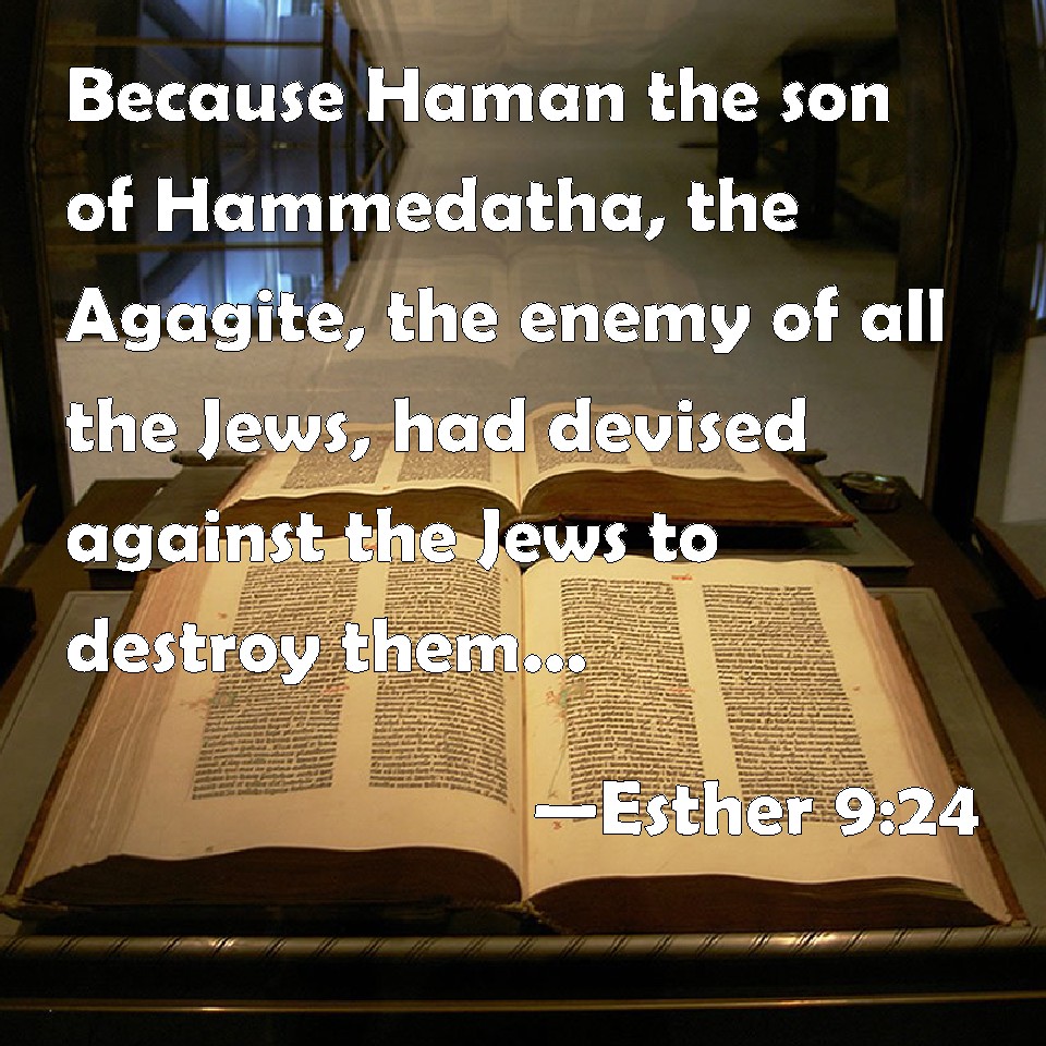 Choose a Background Esther 9:24 Because Haman the son of Hammedatha, the Agagite, the enemy of all the Jews, had devised against the Jews to destroy them, and had cast Pur, that is, the lot, to consume them, and to destroy them; KJV: Because Haman the son of Hammedatha, the Agagite, the enemy of all the Jews, had devised against the Jews to destroy them, and had cast Pur, that is, the lot, to consume them, and to destroy them; DRB: For Aman, the son of Amadathi of the race of Agag, the enemy and adversary of the Jews, had devised evil against them, to kill them and destroy them: and had cast Phur, that is, the lot. DBT: For Haman the son of Hammedatha the Agagite, the oppressor of all the Jews, had devised against the Jews to destroy them, and had cast Pur, that is, the lot, to consume them and to destroy them; ERV: because Haman the son of Hammedatha, the Agagite, the enemy of all the Jews, had devised against the Jews to destroy them, and had cast Pur, that is, the lot, to consume them, and to destroy them; WBT: Because Haman the son of Hammedatha, the Agagite, the enemy of all the Jews, had devised against the Jews to destroy them, and had cast Pur, that is, the lot, to consume them, and to destroy them; WEB: because Haman the son of Hammedatha, the Agagite, the enemy of all the Jews, had plotted against the Jews to destroy them, and had cast "Pur," that is the lot, to consume them, and to destroy them; YLT: because Haman son of Hammedatha the Agagite, adversary of all the Jews, had devised concerning the Jews to destroy them, and had caused to fall Pur — that is the lot — to crush them and to destroy them;Links Esther 9:24 NIV • Esther 9:24 NLT • Esther 9:24 ESV • Esther 9:24 NASB • Esther 9:24 KJV • Esther 9:24 Interlinear • Esther 9:24 Commentaries • Esther 9:24 Parallel Texts • Esther 9:24 Bible Apps • Esther 9:24 Parallel • Bible Hub |