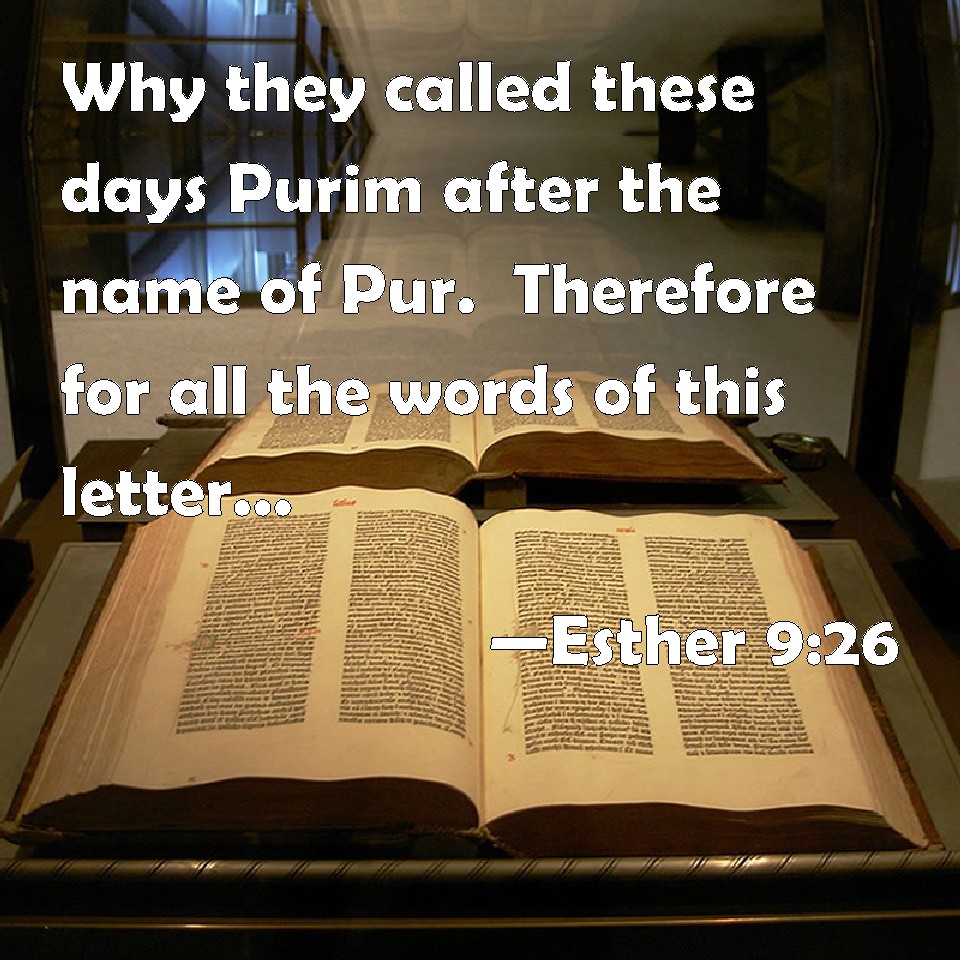 Choose a Background Esther 9:26 Why they called these days Purim after the name of Pur. Therefore for all the words of this letter, and of that which they had seen concerning this matter, and which had come to them, KJV: Wherefore they called these days Purim after the name of Pur. Therefore for all the words of this letter, and of that which they had seen concerning this matter, and which had come unto them, DRB: And since that time these days are called Phurim, that is, of lots: because Phur, that is, the lot, was cast into the urn. And all things that were done, are contained in the volume of this epistle, that is, of this book: DBT: Therefore they called these days Purim after the name of Pur. Therefore, according to all the words of this letter, and for what they had seen concerning this matter and what had happened to them, ERV: Wherefore they called these days Purim, after the name of Pur. Therefore because of all the words of this letter, and of that which they had seen concerning this matter, and that which had come unto them, WBT: Wherefore they called these days Purim after the name of Pur. Therefore for all the words of this letter, and of that which they had seen concerning this matter, and which had come to them, WEB: Therefore they called these days "Purim," from the word "Pur." Therefore because of all the words of this letter, and of that which they had seen concerning this matter, and that which had come to them, YLT: therefore they have called these days Purim — by the name of the lot — therefore, because of all the words of this letter, and what they have seen concerning this, and what hath come unto them,Links Esther 9:26 NIV • Esther 9:26 NLT • Esther 9:26 ESV • Esther 9:26 NASB • Esther 9:26 KJV • Esther 9:26 Interlinear • Esther 9:26 Commentaries • Esther 9:26 Parallel Texts • Esther 9:26 Bible Apps • Esther 9:26 Parallel • Bible Hub |