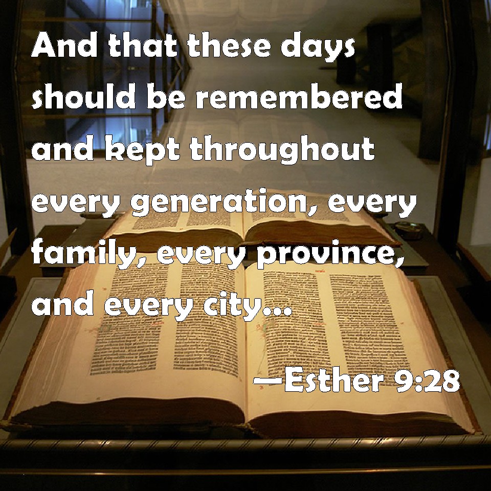 Choose a Background Esther 9:28 And that these days should be remembered and kept throughout every generation, every family, every province, and every city; and that these days of Purim should not fail from among the Jews, nor the memorial of them perish from their seed. KJV: And that these days should be remembered and kept throughout every generation, every family, every province, and every city; and that these days of Purim should not fail from among the Jews, nor the memorial of them perish from their seed. DRB: These are the days which shall never be forgot: and which all provinces in the whole world shall celebrate throughout all generations: neither is there any city wherein the days of Phurim, that is, of lots, must not be observed by the Jews, and by their posterity, which is bound to these ceremonies. DBT: and that these days should be remembered and observed throughout every generation, in every family, every province, and every city, and that these days of Purim should not fail from among the Jews, nor the memorial of them cease from among their seed. ERV: and that these days should be remembered and kept throughout every generation, every family, every province, and every city; and that these days of Purim should not fail from among the Jews, nor the memorial of them perish from their seed. WBT: And that these days should be remembered and kept throughout every generation, every family, every province, and every city; and that these days of Purim should not fail from among the Jews, nor the memorial of them perish from their seed. WEB: and that these days should be remembered and kept throughout every generation, every family, every province, and every city; and that these days of Purim should not fail from among the Jews, nor the memory of them perish from their seed. YLT: and these days are remembered and kept in every generation and generation, family and family, province and province, and city and city, and these days of Purim do not pass away from the midst of the Jews, and their memorial is not ended from their seed.Links Esther 9:28 NIV • Esther 9:28 NLT • Esther 9:28 ESV • Esther 9:28 NASB • Esther 9:28 KJV • Esther 9:28 Interlinear • Esther 9:28 Commentaries • Esther 9:28 Parallel Texts • Esther 9:28 Bible Apps • Esther 9:28 Parallel • Bible Hub |