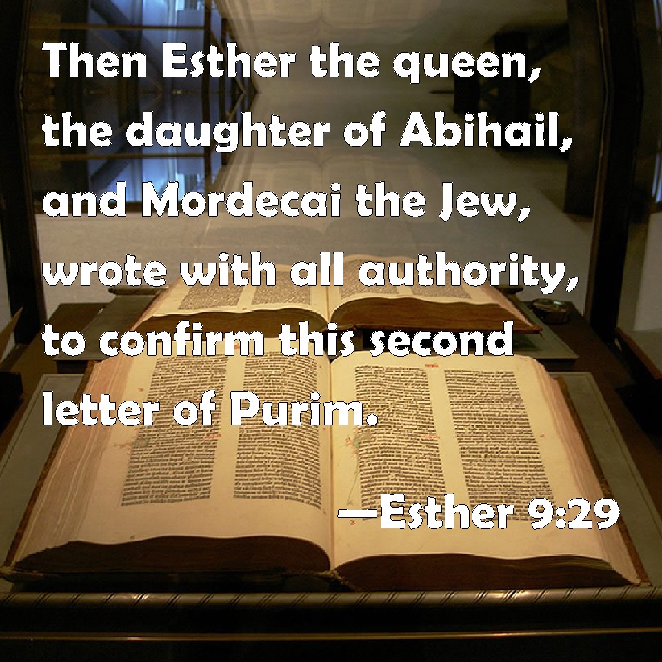 Choose a Background Esther 9:29 Then Esther the queen, the daughter of Abihail, and Mordecai the Jew, wrote with all authority, to confirm this second letter of Purim. KJV: Then Esther the queen, the daughter of Abihail, and Mordecai the Jew, wrote with all authority, to confirm this second letter of Purim. DRB: And Esther the queen, the daughter of Abihail, and Mardochai the Jew, wrote also a second epistle, that with all diligence this day should be established a festival for the time to come. DBT: And queen Esther the daughter of Abihail, and Mordecai the Jew, wrote with all authority to confirm this second letter of Purim. ERV: Then Esther the queen, the daughter of Abihail, and Mordecai the Jew, wrote with all authority to confirm this second letter of Purim. WBT: Then Esther the queen, the daughter of Abihail, and Mordecai the Jew, wrote with all authority, to confirm this second letter of Purim. WEB: Then Esther the queen, the daughter of Abihail, and Mordecai the Jew, wrote with all authority to confirm this second letter of Purim. YLT: And Esther the queen, daughter of Abihail, writeth, and Mordecai the Jew, with all might, to establish this second letter of Purim,Links Esther 9:29 NIV • Esther 9:29 NLT • Esther 9:29 ESV • Esther 9:29 NASB • Esther 9:29 KJV • Esther 9:29 Interlinear • Esther 9:29 Commentaries • Esther 9:29 Parallel Texts • Esther 9:29 Bible Apps • Esther 9:29 Parallel • Bible Hub |