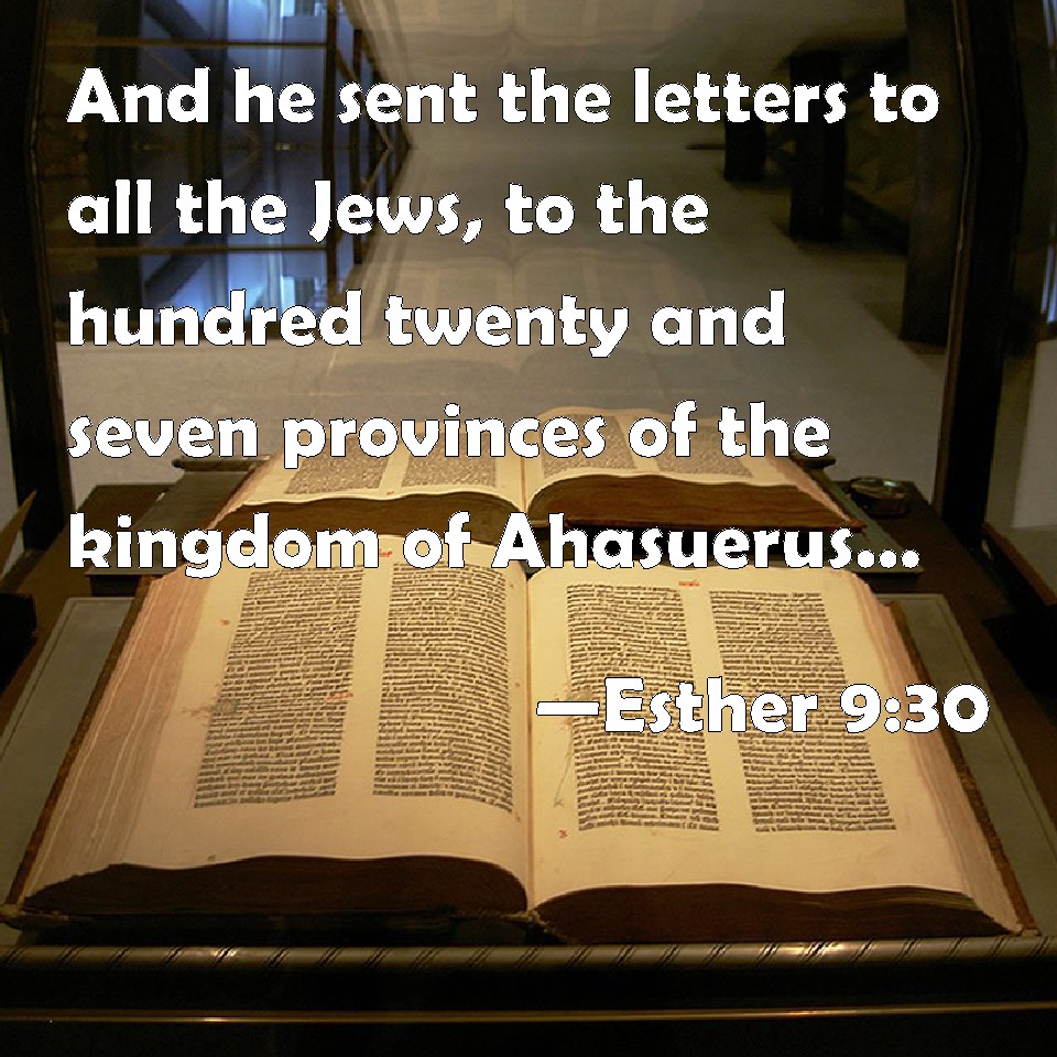 Choose a Background Esther 9:30 And he sent the letters to all the Jews, to the hundred twenty and seven provinces of the kingdom of Ahasuerus, with words of peace and truth, KJV: And he sent the letters unto all the Jews, to the hundred twenty and seven provinces of the kingdom of Ahasuerus, with words of peace and truth, DRB: And they sent to all the Jews that were in the hundred and twenty-seven provinces of king Assuerus, that they should have peace, and receive truth, DBT: And he sent letters to all the Jews, to the hundred and twenty-seven provinces of the kingdom of Ahasuerus, words of peace and truth, ERV: And he sent letters unto all the Jews, to the hundred twenty and seven provinces of the kingdom of Ahasuerus, with words of peace and truth, WBT: And he sent the letters to all the Jews, to the hundred twenty and seven provinces of the kingdom of Ahasuerus, with words of peace and truth, WEB: He sent letters to all the Jews, to the hundred twenty-seven provinces of the kingdom of Ahasuerus, with words of peace and truth, YLT: and he sendeth letters unto all the Jews, unto the seven and twenty and a hundred provinces of the kingdom of Ahasuerus — words of peace and truth — Links Esther 9:30 NIV • Esther 9:30 NLT • Esther 9:30 ESV • Esther 9:30 NASB • Esther 9:30 KJV • Esther 9:30 Interlinear • Esther 9:30 Commentaries • Esther 9:30 Parallel Texts • Esther 9:30 Bible Apps • Esther 9:30 Parallel • Bible Hub |