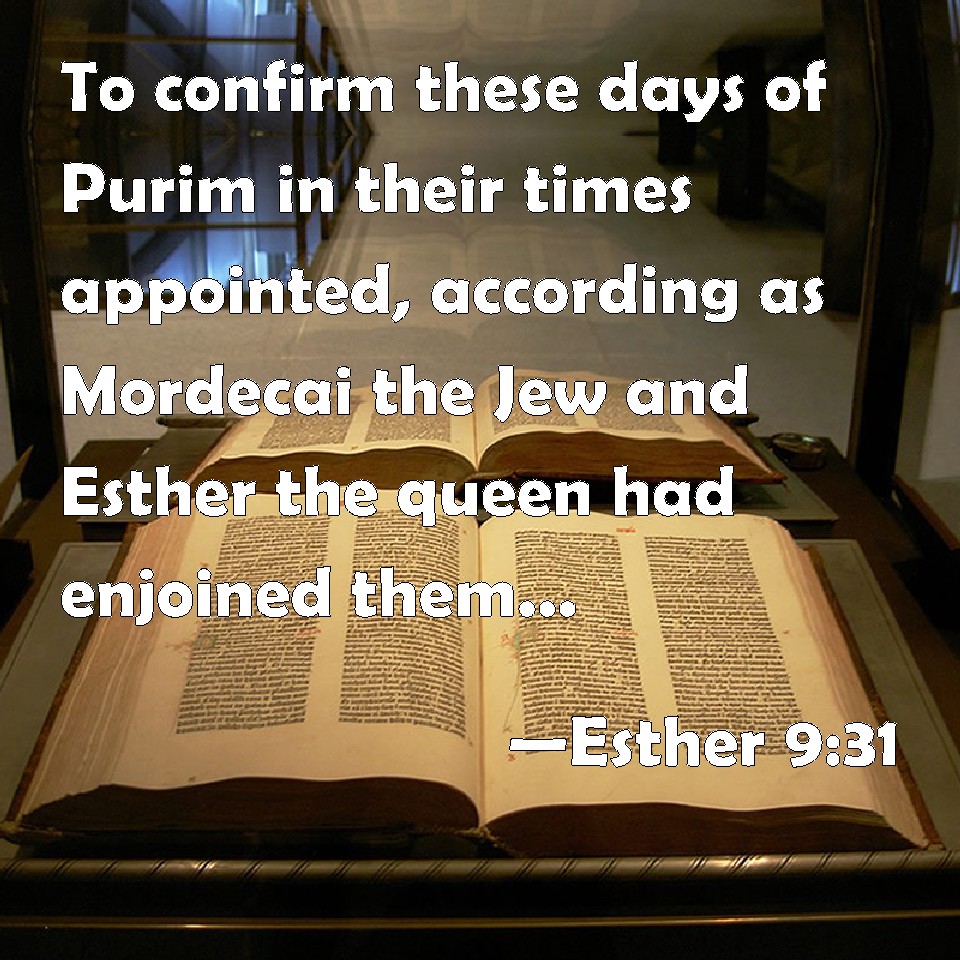 Choose a Background Esther 9:31 To confirm these days of Purim in their times appointed, according as Mordecai the Jew and Esther the queen had enjoined them, and as they had decreed for themselves and for their seed, the matters of the fastings and their cry. KJV: To confirm these days of Purim in their times appointed, according as Mordecai the Jew and Esther the queen had enjoined them, and as they had decreed for themselves and for their seed, the matters of the fastings and their cry. DRB: And observe the days of lots, and celebrate them with joy in their proper time: as Mardochai and Esther had appointed, and they undertook them to be observed by themselves and by their seed, fasts, and cries, and the days of lots, DBT: to confirm these days of Purim in their fixed times, according as Mordecai the Jew and queen Esther had enjoined them, and as they had decreed for themselves and for their seed, as to the matters of the fastings and their cry. ERV: to confirm these days of Purim in their appointed times, according as Mordecai the Jew and Esther the queen had enjoined them, and as they had ordained for themselves and for their seed, in the matter of the fastings and their cry. WBT: To confirm these days of Purim in their times appointed, according as Mordecai the Jew and Esther the queen had enjoined them, and as they had decreed for themselves and for their seed, the matters of the fastings and their cry. WEB: to confirm these days of Purim in their appointed times, as Mordecai the Jew and Esther the queen had decreed, and as they had imposed upon themselves and their descendants, in the matter of the fastings and their cry. YLT: to establish these days of Purim, in their seasons, as Mordecai the Jew hath established on them, and Esther the queen, and as they had established on themselves, and on their seed — matters of the fastings, and of their cry.Links Esther 9:31 NIV • Esther 9:31 NLT • Esther 9:31 ESV • Esther 9:31 NASB • Esther 9:31 KJV • Esther 9:31 Interlinear • Esther 9:31 Commentaries • Esther 9:31 Parallel Texts • Esther 9:31 Bible Apps • Esther 9:31 Parallel • Bible Hub |