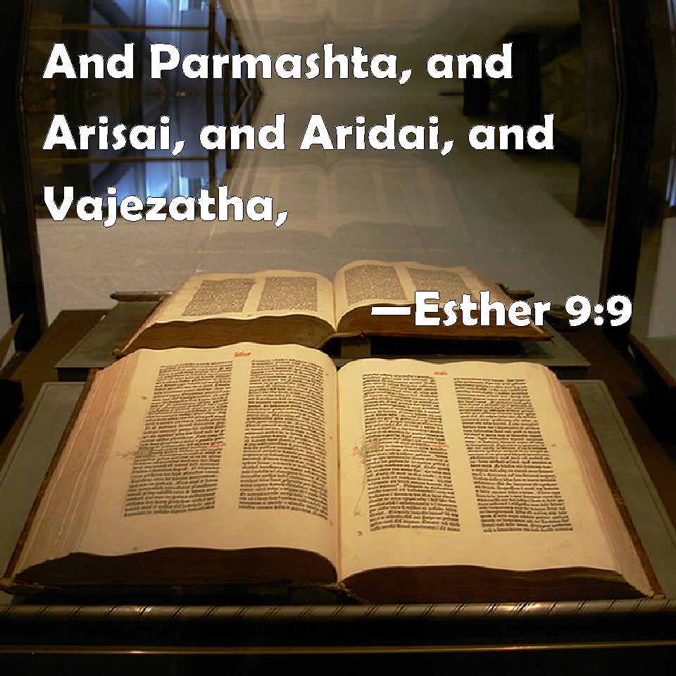 Choose a Background Esther 9:9 And Parmashta, and Arisai, and Aridai, and Vajezatha, KJV: And Parmashta, and Arisai, and Aridai, and Vajezatha, DRB: And Phermesta, and Arisai, and Aridai, and Jezatha. DBT: and Parmashta, and Arisai, and Aridai, and Vajezatha, ERV: and Parmashta, and Arisai, and Aridai, and Vaizatha, WBT: And Parmashta, and Arisai, and Aridai, and Vajezatha, WEB: Parmashta, Arisai, Aridai, and Vaizatha, YLT: and Parmashta, and Arisai, and Aridai, and Vajezatha,Links Esther 9:9 NIV • Esther 9:9 NLT • Esther 9:9 ESV • Esther 9:9 NASB • Esther 9:9 KJV • Esther 9:9 Interlinear • Esther 9:9 Commentaries • Esther 9:9 Parallel Texts • Esther 9:9 Bible Apps • Esther 9:9 Parallel • Bible Hub |