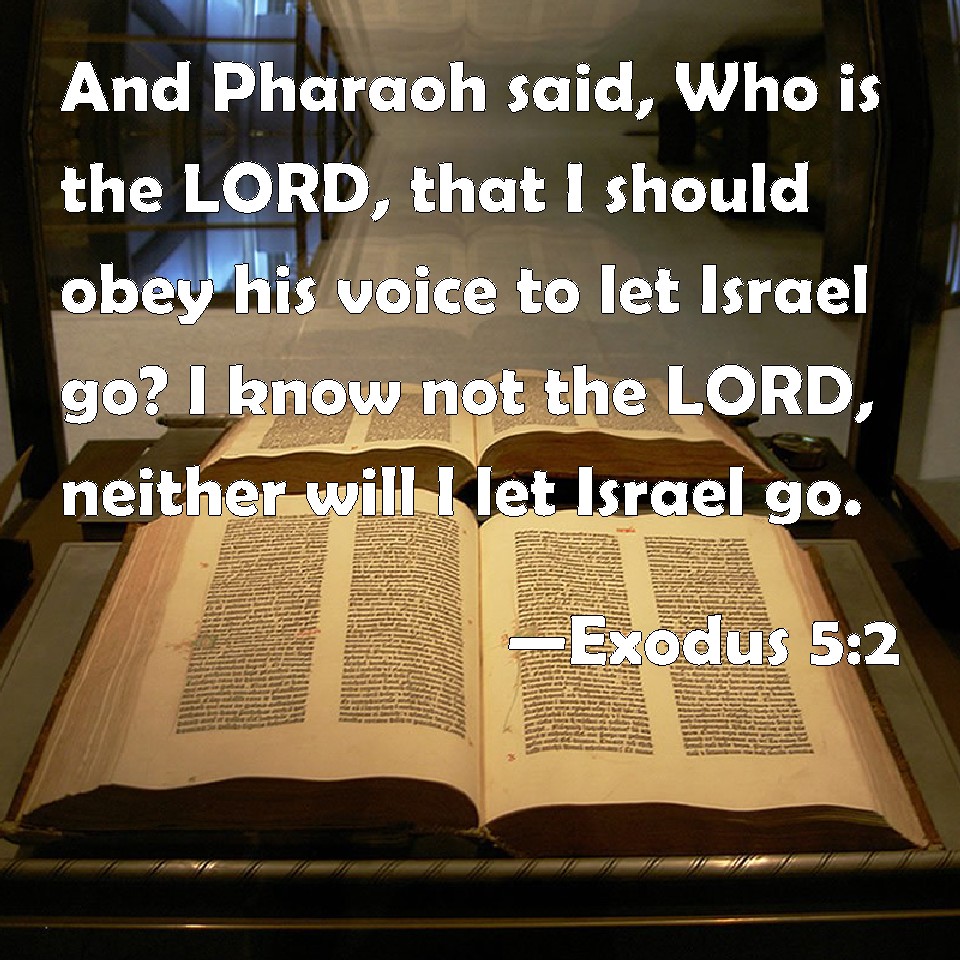 Choose a Background Exodus 5:2 And Pharaoh said, Who is the LORD, that I should obey his voice to let Israel go? I know not the LORD, neither will I let Israel go. KJV: And Pharaoh said, Who is the LORD, that I should obey his voice to let Israel go? I know not the LORD, neither will I let Israel go. DRB: But he answered: Who is the Lord, that I should hear his voice, and let Israel go? I know not the Lord, neither will I let Israel go. DBT: And Pharaoh said, Who is Jehovah, to whose voice I am to hearken to let Israel go? I do not know Jehovah, neither will I let Israel go. ERV: And Pharaoh said, Who is the LORD, that I should hearken unto his voice to let Israel go? I know not the LORD, and moreover I will not let Israel go. WBT: And Pharaoh said, Who is the LORD, that I should obey his voice to let Israel go? I know not the LORD, neither will I let Israel go. WEB: Pharaoh said, "Who is Yahweh, that I should listen to his voice to let Israel go? I don't know Yahweh, and moreover I will not let Israel go." YLT: and Pharaoh saith, 'Who is Jehovah, that I hearken to His voice, to send Israel away? I have not known Jehovah, and Israel also I do not send away.'Links Exodus 5:2 NIV • Exodus 5:2 NLT • Exodus 5:2 ESV • Exodus 5:2 NASB • Exodus 5:2 KJV • Exodus 5:2 Interlinear • Exodus 5:2 Commentaries • Exodus 5:2 Parallel Texts • Exodus 5:2 Bible Apps • Exodus 5:2 Parallel • Bible Hub |