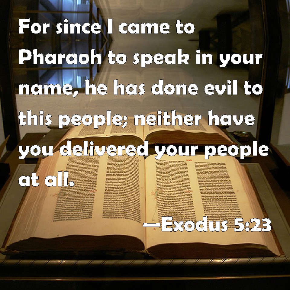 Choose a Background Exodus 5:23 For since I came to Pharaoh to speak in your name, he has done evil to this people; neither have you delivered your people at all. KJV: For since I came to Pharaoh to speak in thy name, he hath done evil to this people; neither hast thou delivered thy people at all. DRB: For since the time that I went in to Pharao to speak in thy name, he hath afflicted thy people: and thou hast not delivered them. DBT: For ever since I came to Pharaoh to speak in thy name, he hath done evil to this people; neither hast thou delivered thy people at all! ERV: For since I came to Pharaoh to speak in thy name, he hath evil entreated this people; neither hast thou delivered thy people at all. WBT: For since I came to Pharaoh to speak in thy name, he hath done evil to this people; neither hast thou delivered thy people at all. WEB: For since I came to Pharaoh to speak in your name, he has brought trouble on this people; neither have you delivered your people at all." YLT: and since I have come unto Pharaoh, to speak in Thy name, he hath done evil to this people, and Thou hast not at all delivered Thy people.'Links Exodus 5:23 NIV • Exodus 5:23 NLT • Exodus 5:23 ESV • Exodus 5:23 NASB • Exodus 5:23 KJV • Exodus 5:23 Interlinear • Exodus 5:23 Commentaries • Exodus 5:23 Parallel Texts • Exodus 5:23 Bible Apps • Exodus 5:23 Parallel • Bible Hub |