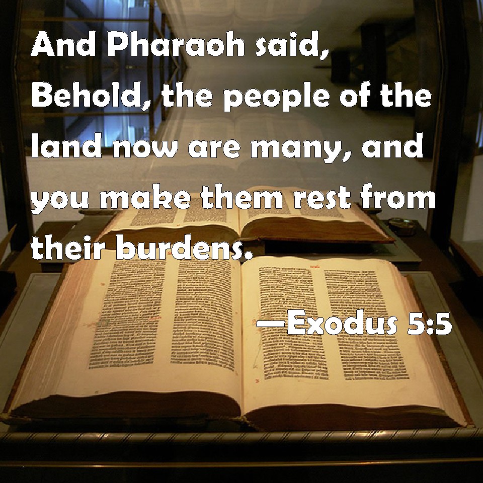 Choose a Background Exodus 5:5 And Pharaoh said, Behold, the people of the land now are many, and you make them rest from their burdens. KJV: And Pharaoh said, Behold, the people of the land now are many, and ye make them rest from their burdens. DRB: And Pharao said: The people of the land is numerous: you see that the multitude is increased: how much more if you give them rest from their works? DBT: And Pharaoh said, Behold the people of the land are now many, and ye wish to make them rest from their burdens. ERV: And Pharaoh said, Behold, the people of the land are now many, and ye make them rest from their burdens. WBT: And Pharaoh said, Behold, the people of the land now are many, and ye make them rest from their burdens. WEB: Pharaoh said, "Behold, the people of the land are now many, and you make them rest from their burdens." YLT: Pharaoh also saith, 'Lo, numerous now is the people of the land, and ye have caused them to cease from their burdens!'Links Exodus 5:5 NIV • Exodus 5:5 NLT • Exodus 5:5 ESV • Exodus 5:5 NASB • Exodus 5:5 KJV • Exodus 5:5 Interlinear • Exodus 5:5 Commentaries • Exodus 5:5 Parallel Texts • Exodus 5:5 Bible Apps • Exodus 5:5 Parallel • Bible Hub |