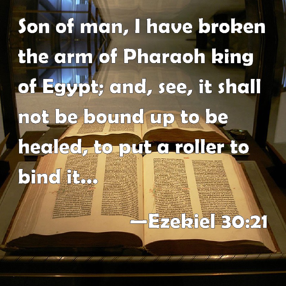Choose a Background Ezekiel 30:21 Son of man, I have broken the arm of Pharaoh king of Egypt; and, see, it shall not be bound up to be healed, to put a roller to bind it, to make it strong to hold the sword. KJV: Son of man, I have broken the arm of Pharaoh king of Egypt; and, lo, it shall not be bound up to be healed, to put a roller to bind it, to make it strong to hold the sword. DRB: Son of man, I have broken the arm of Pharao king of Egypt: and behold it is not bound up, to be healed, to be tied up with clothes, and swathed with linen, that it might recover strength, and hold the sword. DBT: Son of man, I have broken the arm of Pharaoh king of Egypt; and behold, it shall not be bound up to apply remedies, to put a bandage to bind it, to make it strong to hold the sword. ERV: Son of man, I have broken the arm of Pharaoh king of Egypt; and, lo, it hath not been bound up to apply healing medicines, to put a roller to bind it, that it be strong to hold the sword. WBT: Son of man, I have broken the arm of Pharaoh king of Egypt; and lo, it shall not be bound up to be healed, to put a roller to bind it, to make it strong to hold the sword. WEB: Son of man, I have broken the arm of Pharaoh king of Egypt; and behold, it has not been bound up, to apply [healing] medicines, to put a bandage to bind it, that it be strong to hold the sword. YLT: The arm of Pharaoh, king of Egypt, I have broken, And lo, it hath not been bound up to give healing, To put a bandage to bind it, To strengthen it — to lay hold on the sword.Links Ezekiel 30:21 NIV • Ezekiel 30:21 NLT • Ezekiel 30:21 ESV • Ezekiel 30:21 NASB • Ezekiel 30:21 KJV • Ezekiel 30:21 Interlinear • Ezekiel 30:21 Commentaries • Ezekiel 30:21 Parallel Texts • Ezekiel 30:21 Bible Apps • Ezekiel 30:21 Parallel • Bible Hub |