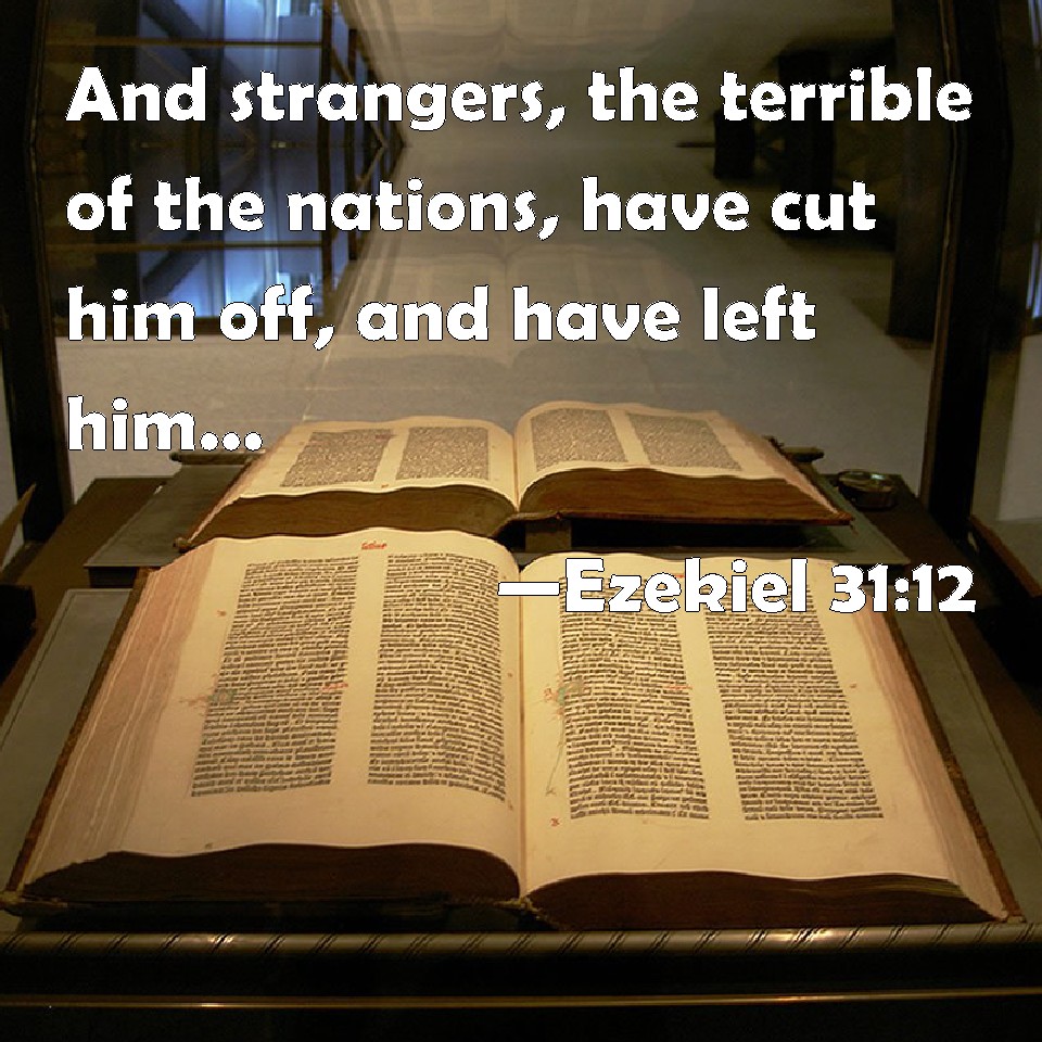 Choose a Background Ezekiel 31:12 And strangers, the terrible of the nations, have cut him off, and have left him: on the mountains and in all the valleys his branches are fallen, and his boughs are broken by all the rivers of the land; and all the people of the earth are gone down from his shadow, and have left him. KJV: And strangers, the terrible of the nations, have cut him off, and have left him: upon the mountains and in all the valleys his branches are fallen, and his boughs are broken by all the rivers of the land; and all the people of the earth are gone down from his shadow, and have left him. DRB: And strangers, and the most cruel of the nations shall cut him down, and cast him away upon the mountains, and his boughs shall fall in every valley, and his branches shall be broken on every rock of the country: and all the people of the earth shall depart from his shadow, and leave him. DBT: And strangers, the terrible of the nations, have cut him off and have left him; upon the mountains and in all the valleys his branches are fallen, and his boughs are broken in all the watercourses of the land; and all the peoples of the earth are gone down from his shadow, and have left him. ERV: And strangers, the terrible of the nations, have cut him off, and have left him: upon the mountains and in all the valleys his branches are fallen, and his boughs are broken by all the watercourses of the land; and all the peoples of the earth are gone down from his shadow, and have left him. WBT: And strangers, the terrible of the nations, have cut him off, and have left him: upon the mountains and in all the valleys his branches are fallen, and his boughs are broken by all the rivers of the land; and all the people of the earth have gone down from his shade, and have left him. WEB: Strangers, the terrible of the nations, have cut him off, and have left him: on the mountains and in all the valleys his branches are fallen, and his boughs are broken by all the watercourses of the land; and all the peoples of the earth are gone down from his shadow, and have left him. YLT: And cut him off do strangers, The terrible of nations, and they leave him, On the mountains and in all valleys have his thin shoots fallen, And broken are his boughs at all streams of the land, And go down from his shade do all peoples of the land, and they leave him.Links Ezekiel 31:12 NIV • Ezekiel 31:12 NLT • Ezekiel 31:12 ESV • Ezekiel 31:12 NASB • Ezekiel 31:12 KJV • Ezekiel 31:12 Interlinear • Ezekiel 31:12 Commentaries • Ezekiel 31:12 Parallel Texts • Ezekiel 31:12 Bible Apps • Ezekiel 31:12 Parallel • Bible Hub |