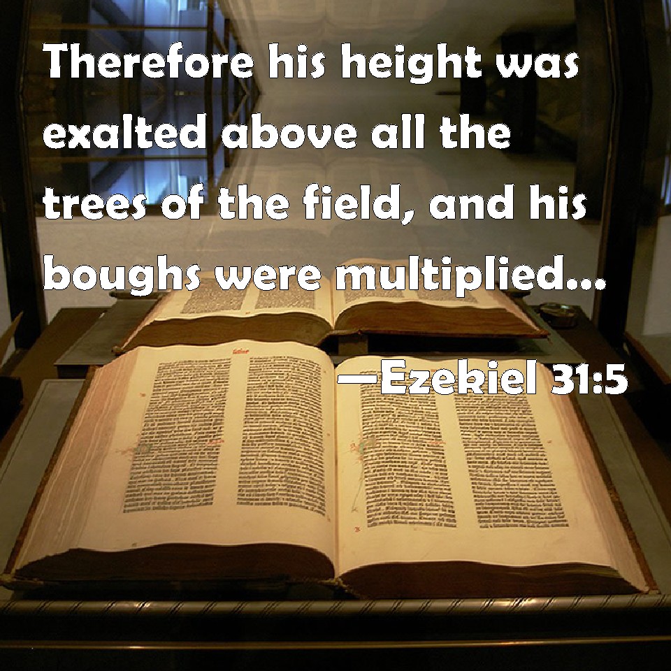Choose a Background Ezekiel 31:5 Therefore his height was exalted above all the trees of the field, and his boughs were multiplied, and his branches became long because of the multitude of waters, when he shot forth. KJV: Therefore his height was exalted above all the trees of the field, and his boughs were multiplied, and his branches became long because of the multitude of waters, when he shot forth. DRB: Therefore was his height exalted above all the trees of the country: and his branches were multiplied, and his boughs were elevated because of many waters. DBT: Therefore his height was exalted above all the trees of the field, and his boughs were multiplied, and his branches became long, because of great waters, when he shot forth. ERV: Therefore his stature was exalted above all the trees of the field: and his boughs were multiplied, and his branches became long by reason of many waters, when he shot them forth. WBT: Therefore his hight was exalted above all the trees of the field, and his boughs were multiplied, and his branches became long because of the multitude of waters, when he shot forth. WEB: Therefore its stature was exalted above all the trees of the field; and its boughs were multiplied, and its branches became long by reason of many waters, when it shot [them] forth. YLT: Therefore higher hath been his stature than all trees of the field, And multiplied are his boughs, and long are his branches, Because of many waters in his shooting forth,Links Ezekiel 31:5 NIV • Ezekiel 31:5 NLT • Ezekiel 31:5 ESV • Ezekiel 31:5 NASB • Ezekiel 31:5 KJV • Ezekiel 31:5 Interlinear • Ezekiel 31:5 Commentaries • Ezekiel 31:5 Parallel Texts • Ezekiel 31:5 Bible Apps • Ezekiel 31:5 Parallel • Bible Hub |