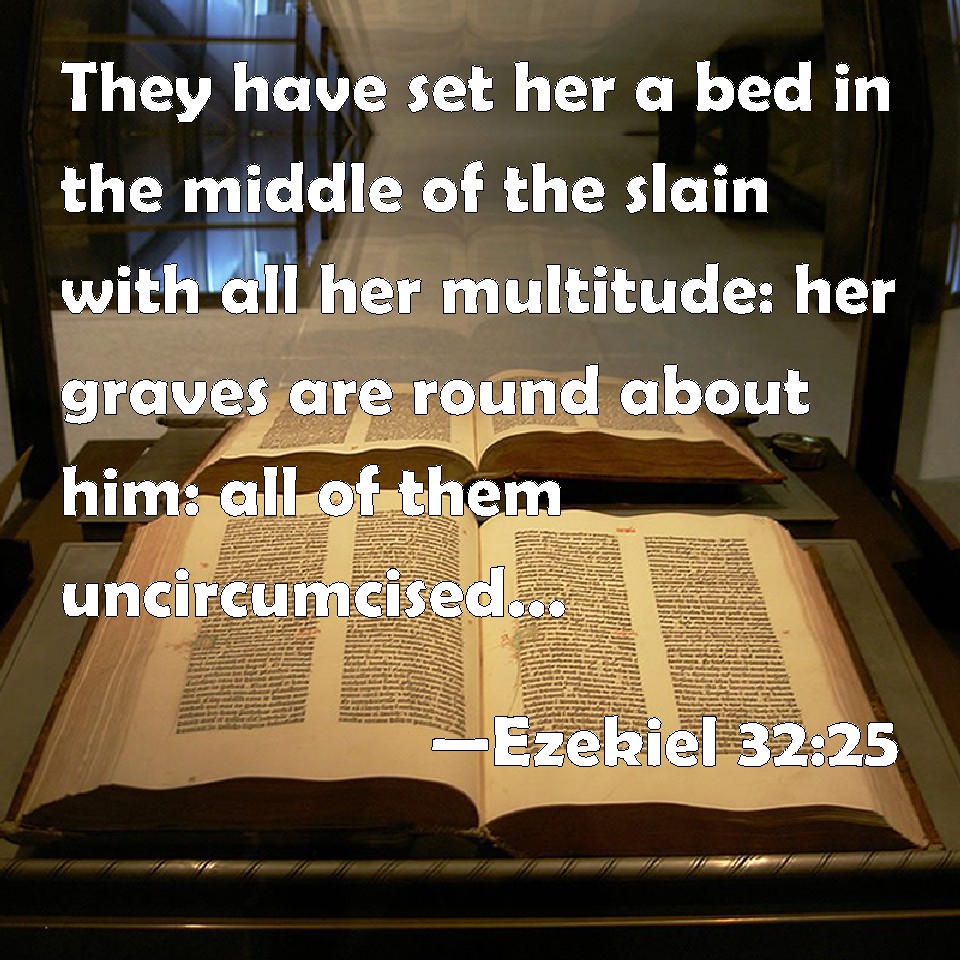 Ezekiel 32:25 They have set her a bed in the middle of the slain with all her multitude: her graves are round about him: all of them uncircumcised, slain by the sword: though their terror was caused in the land of the living, yet have they borne their shame with them that go down to the pit: he is put in the middle of them that be slain.