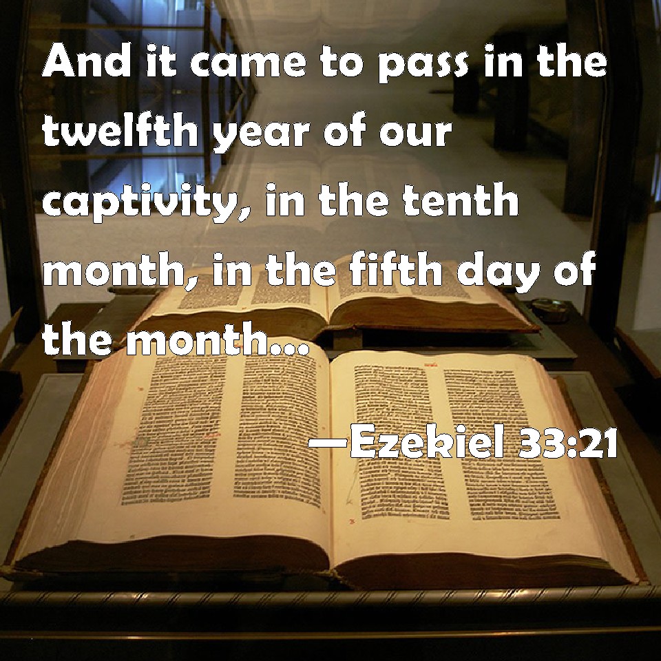 Choose a Background Ezekiel 33:21 And it came to pass in the twelfth year of our captivity, in the tenth month, in the fifth day of the month, that one that had escaped out of Jerusalem came to me, saying, The city is smitten. KJV: And it came to pass in the twelfth year of our captivity, in the tenth month, in the fifth day of the month, that one that had escaped out of Jerusalem came unto me, saying, The city is smitten. DRB: And it came to pass in the twelfth year of our captivity, in the tenth month, in the fifth day of the month, that there came to me one that was fled from Jerusalem, saying: The city is laid waste. DBT: And it came to pass in the twelfth year of our captivity, in the tenth month, on the fifth of the month, that one who had escaped out of Jerusalem came unto me, saying, The city is smitten! ERV: And it came to pass in the twelfth year of our captivity, in the tenth month, in the fifth day of the month, that one that had escaped out of Jerusalem came unto me, saying, The city is smitten. WBT: And it came to pass in the twelfth year of our captivity, in the tenth month, in the fifth day of the month, that one that had escaped out of Jerusalem came to me, saying, The city is smitten. WEB: It happened in the twelfth year of our captivity, in the tenth [month], in the fifth [day] of the month, that one who had escaped out of Jerusalem came to me, saying, The city has been struck. YLT: And it cometh to pass, in the twelfth year — in the tenth month, in the fifth of the month — of our removal, come in unto me doth one who is escaped from Jerusalem, saying, 'The city hath been smitten.'Links Ezekiel 33:21 NIV • Ezekiel 33:21 NLT • Ezekiel 33:21 ESV • Ezekiel 33:21 NASB • Ezekiel 33:21 KJV • Ezekiel 33:21 Interlinear • Ezekiel 33:21 Commentaries • Ezekiel 33:21 Parallel Texts • Ezekiel 33:21 Bible Apps • Ezekiel 33:21 Parallel • Bible Hub |