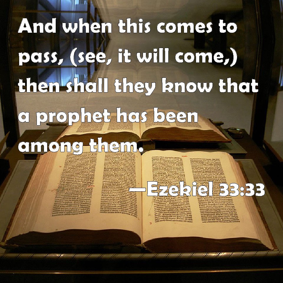 Choose a Background Ezekiel 33:33 And when this comes to pass, (see, it will come,) then shall they know that a prophet has been among them. KJV: And when this cometh to pass, (lo, it will come,) then shall they know that a prophet hath been among them. DRB: And when that which was foretold shall come to pass, (for behold it is coming,) then shall they know that a prophet bath been among them. DBT: And when this cometh to pass (behold, it will come), then shall they know that a prophet hath been among them. ERV: And when this cometh to pass, (behold, it cometh,) then shall they know that a prophet hath been among them. WBT: And when this cometh to pass, (lo, it will come,) then shall they know that a prophet hath been among them. WEB: When this comes to pass, (behold, it comes), then shall they know that a prophet has been among them. YLT: And in its coming in — lo, it hath come, And they have known that a prophet hath been in their midst!'Links Ezekiel 33:33 NIV • Ezekiel 33:33 NLT • Ezekiel 33:33 ESV • Ezekiel 33:33 NASB • Ezekiel 33:33 KJV • Ezekiel 33:33 Interlinear • Ezekiel 33:33 Commentaries • Ezekiel 33:33 Parallel Texts • Ezekiel 33:33 Bible Apps • Ezekiel 33:33 Parallel • Bible Hub |