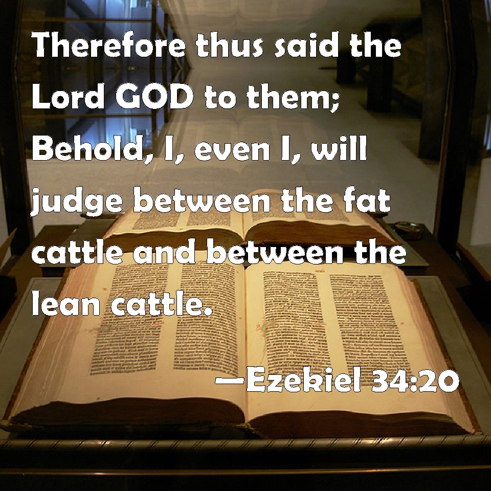 Choose a Background Ezekiel 34:20 Therefore thus said the Lord GOD to them; Behold, I, even I, will judge between the fat cattle and between the lean cattle. KJV: Therefore thus saith the Lord GOD unto them; Behold, I, even I, will judge between the fat cattle and between the lean cattle. DRB: Therefore thus saith the Lord God to you: Behold, I myself will judge between the fat cattle and the lean. DBT: Therefore thus saith the Lord Jehovah unto them: Behold, it is I, and I will judge between the fat sheep and the lean sheep. ERV: Therefore thus saith the Lord GOD unto them: Behold, I, even I, judge between the fat cattle and the lean cattle. WBT: Therefore thus saith the Lord GOD to them; Behold, I, even I, will judge between the fat cattle and between the lean cattle. WEB: Therefore thus says the Lord Yahweh to them: Behold, I, even I, will judge between the fat sheep and the lean sheep. YLT: Therefore, thus said the Lord Jehovah to them: Lo, I — even I, have judged between fat sheep and lean sheep.Links Ezekiel 34:20 NIV • Ezekiel 34:20 NLT • Ezekiel 34:20 ESV • Ezekiel 34:20 NASB • Ezekiel 34:20 KJV • Ezekiel 34:20 Interlinear • Ezekiel 34:20 Commentaries • Ezekiel 34:20 Parallel Texts • Ezekiel 34:20 Bible Apps • Ezekiel 34:20 Parallel • Bible Hub |